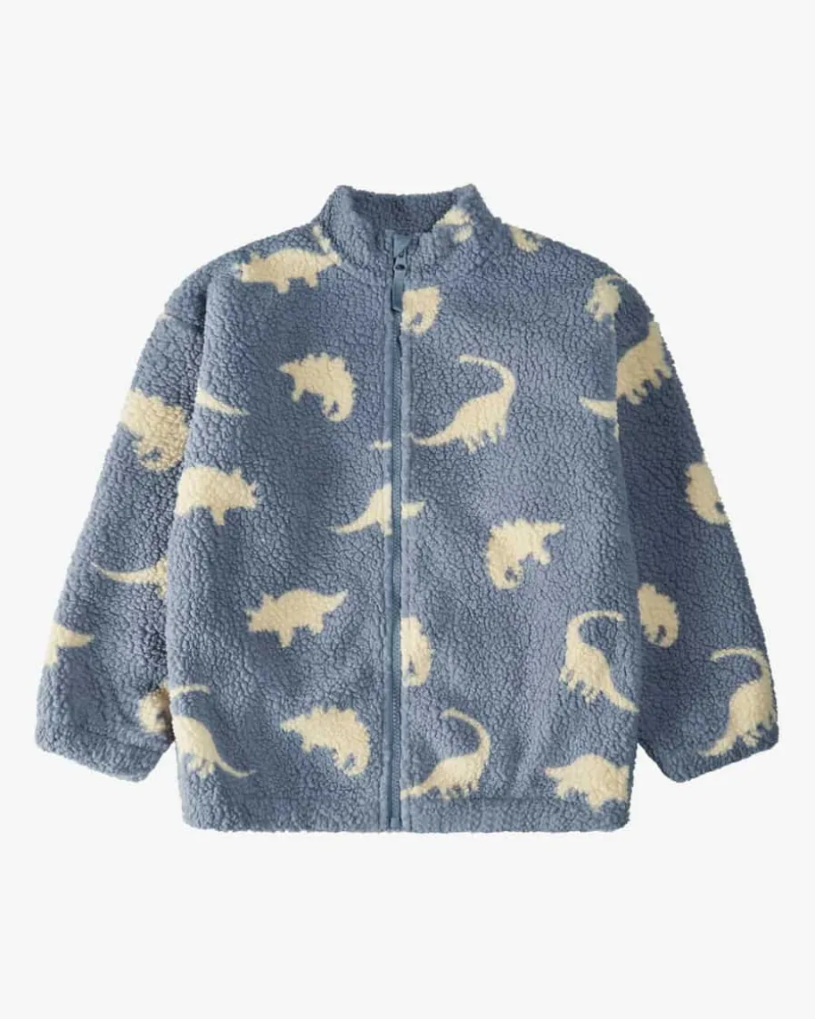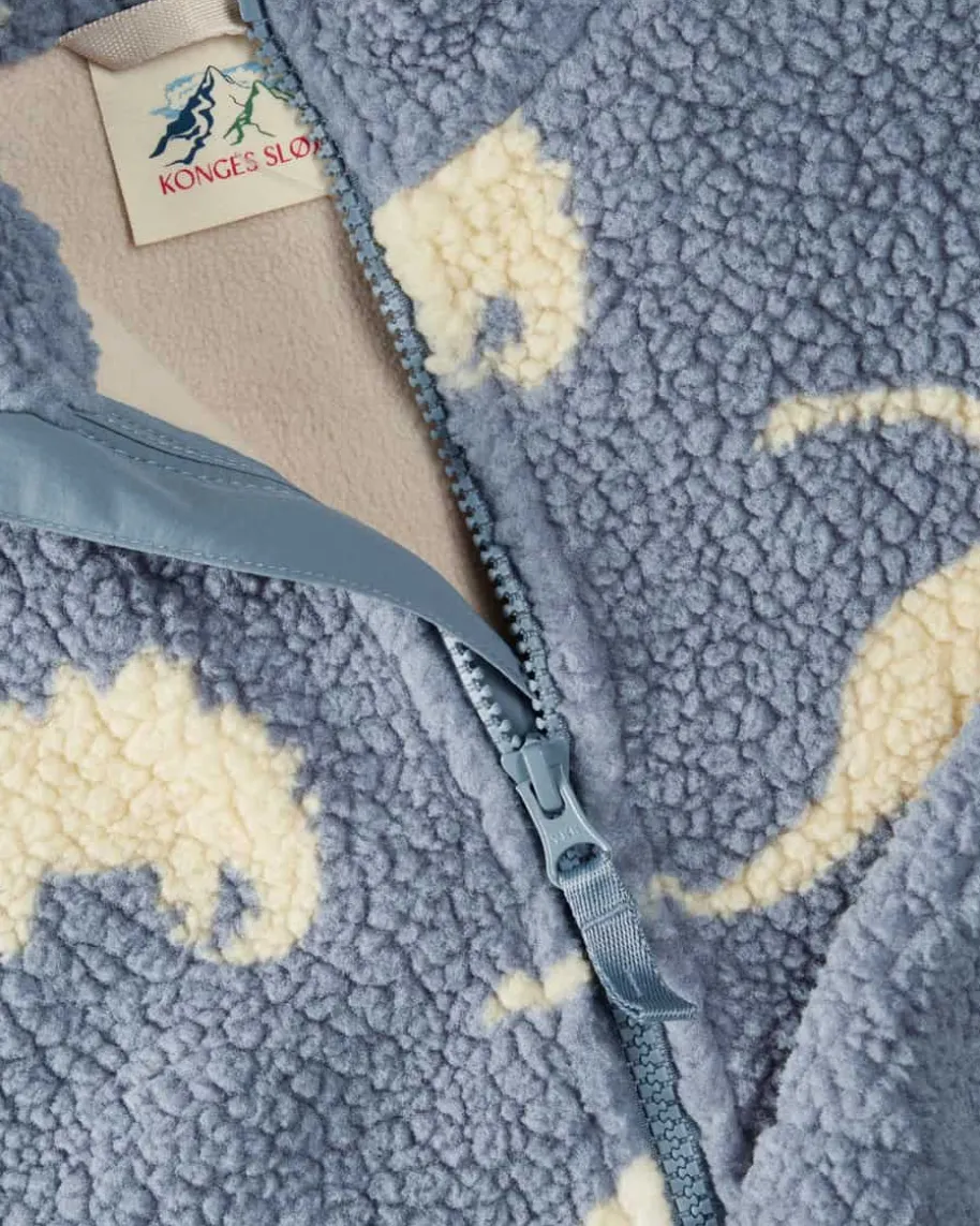Jody Fleecejacke für Jungen von Konges Slojd in Blau und Off-White. Das Modellpunktet dank der weichen Fleece-Qualität mit einer angenehmen Haptik, währenddas Dinosaurier-Allover-Muster verspielte Akzente setzt.