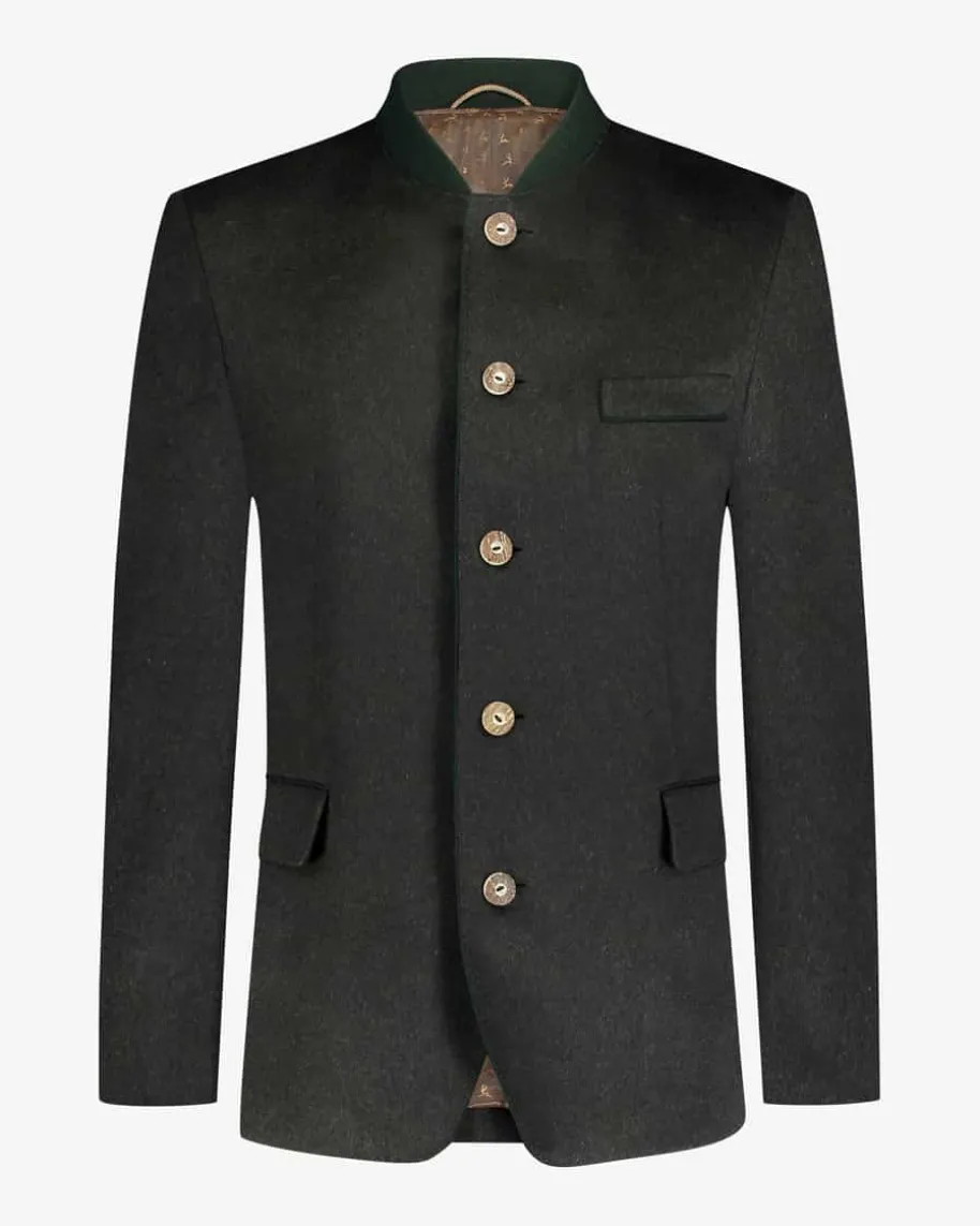 Johann Karl Trachten-Janker für Herren von Habsburg in Dunkelgrün. Das ModellmitTaillenabnähern weist dank der Verwendung von feinen Cashmere-Fasern eine weicheund zugleich edle Haptik auf. Klassische Hirschhornknöpfe sowie kontrastierendeElemente am Stehkragen und den drei Außentaschen setzen traditionelle Akzente,während die Rückseite eine Kellerfalte sowie einen geknöpften Riegel aufweist.