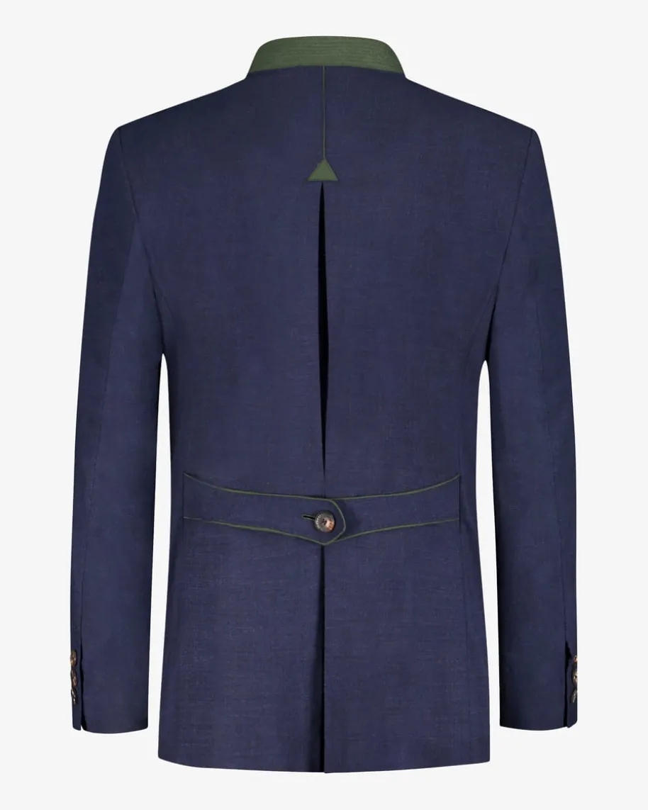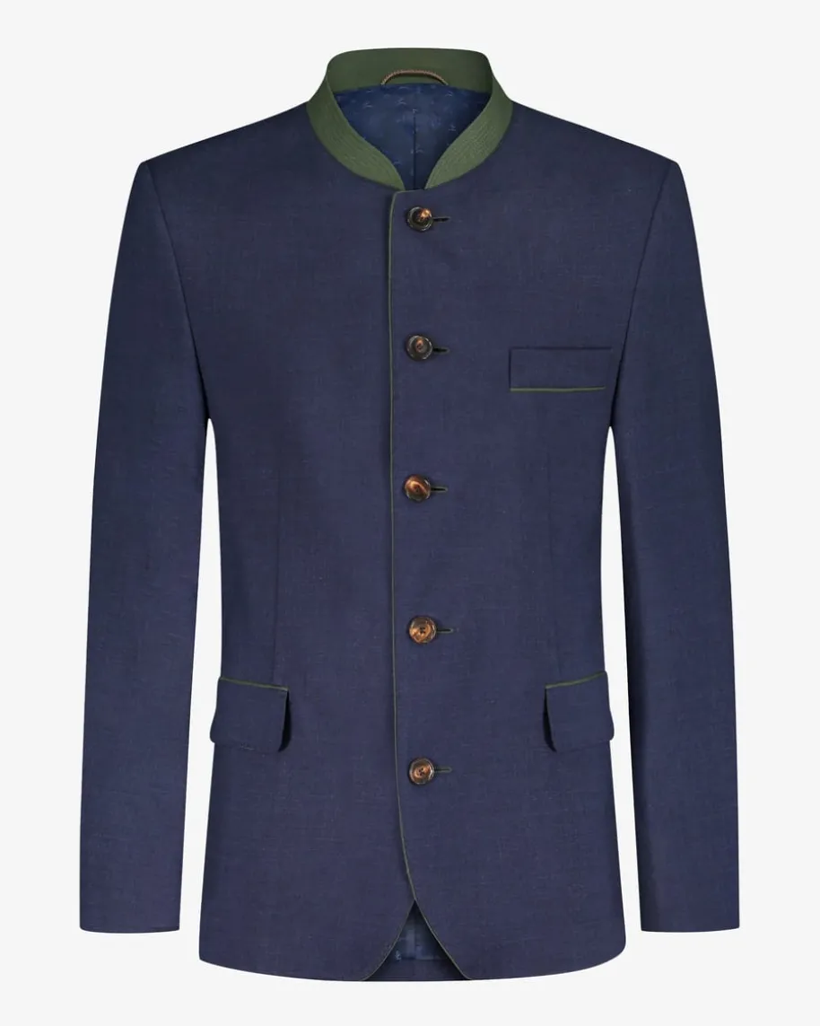 Johann Karl Trachten-Janker für Herren von Habsburg in Dunkelblau undDunkelgrün. Die hochwertige Woll-Seiden-Qualität schafft ein feines Webmuster,welches dank kontrastierenden Paspeln als auch einem Stehkragen stilvolluntermalen wird.