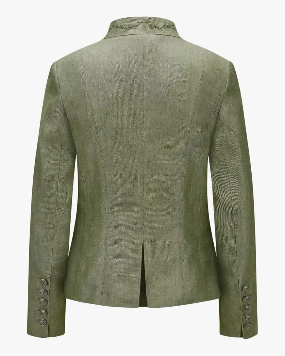 Juliette Trachtenblazer für Damen von Grasegger Manufaktur in Oliv. Dastaillierte Modell aus hochwertiger Leinen-Qualität präsentiert sich dank derstilvollen Knöpfe in traditionell-authentischer Aufmachung, während dierückseitige Kellerfalte sowie feine Stickereien auf dem Kragen den Trachten-Lookharmonisch vollenden.