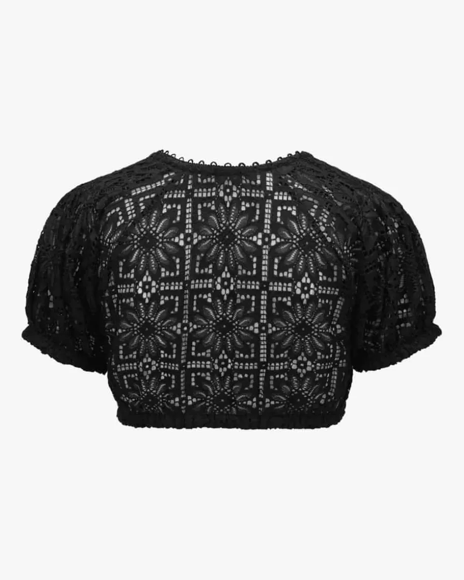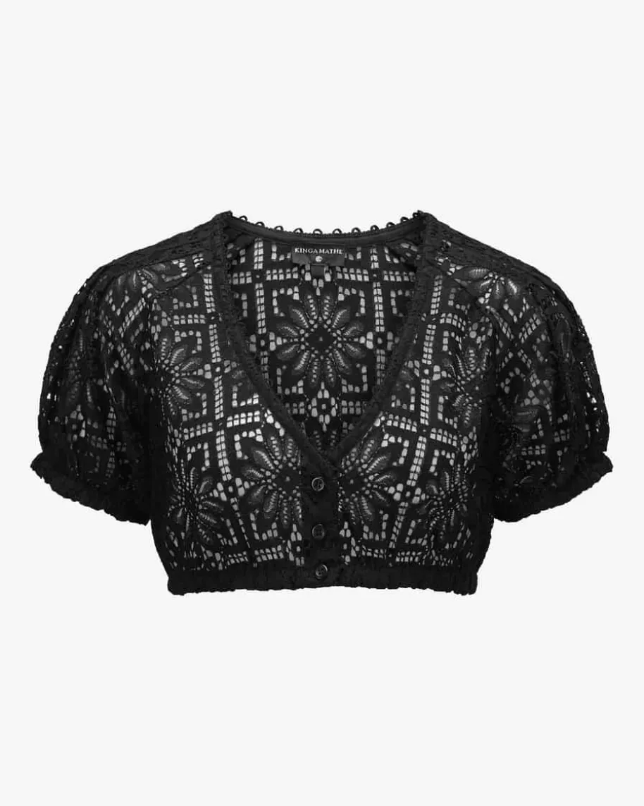 Kaira Dirndlbluse für Damen von Kinga Mathe in Weiß. Das kurzärmelige Modellüberzeugt dank der floralen Loch-Spitze in traditionell-femininer Aufmachung,während der in Falten gelegte Ärmel den Trachten-Look gekonnt vollendet.