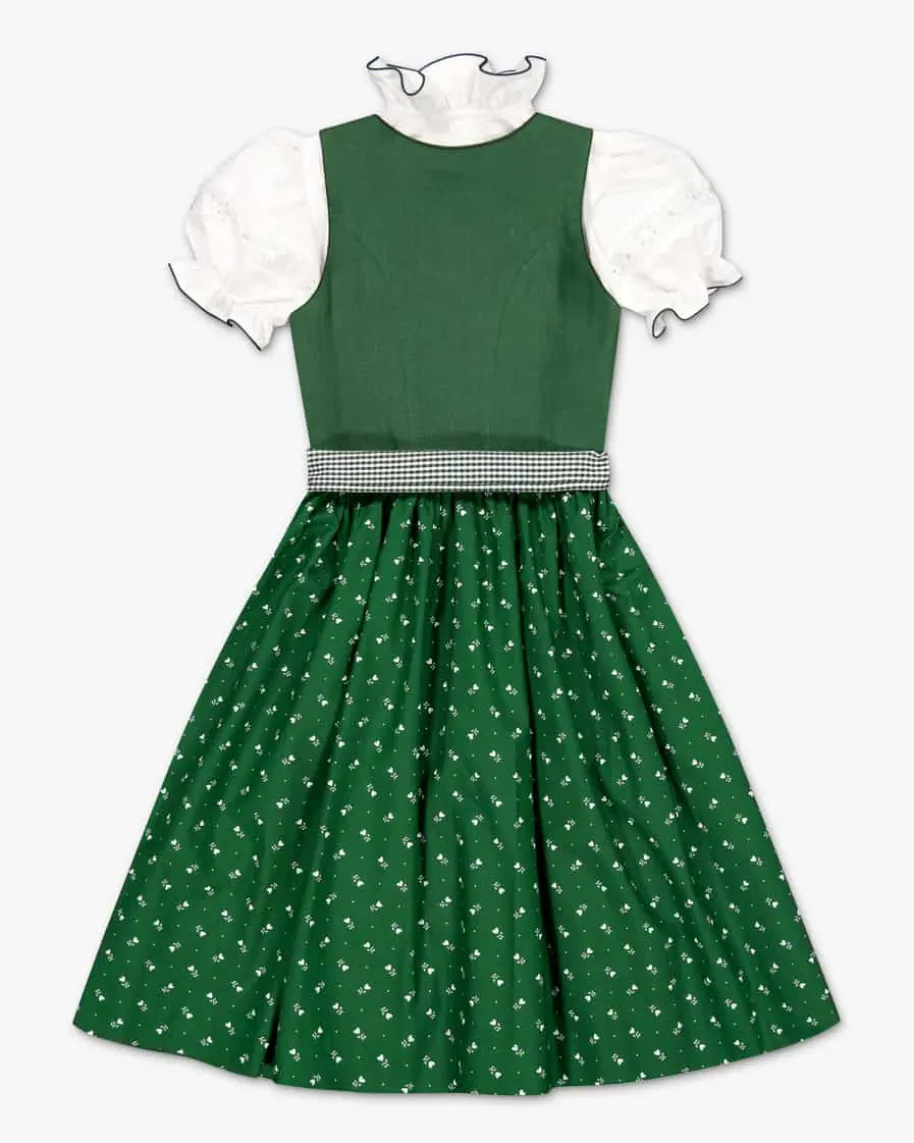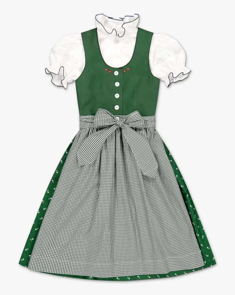 Katharina Dirndl mit Bluse und Schürze für Mädchen von Pacher in Dunkelgrün undWeiß. Das Modell punktet mit niedlich besticktem Leinen-Mieder sowie dem zartenAllover-Dessin auf dem Rock. Gleichzeitig runden die changierenden Knöpfe sowiedie traditionelle Karo-Schürze in Kombination mit der Bluse mit Rüschen-Verzierungen und Paspelierungen den süßen Trachten-Look harmonisch ab.