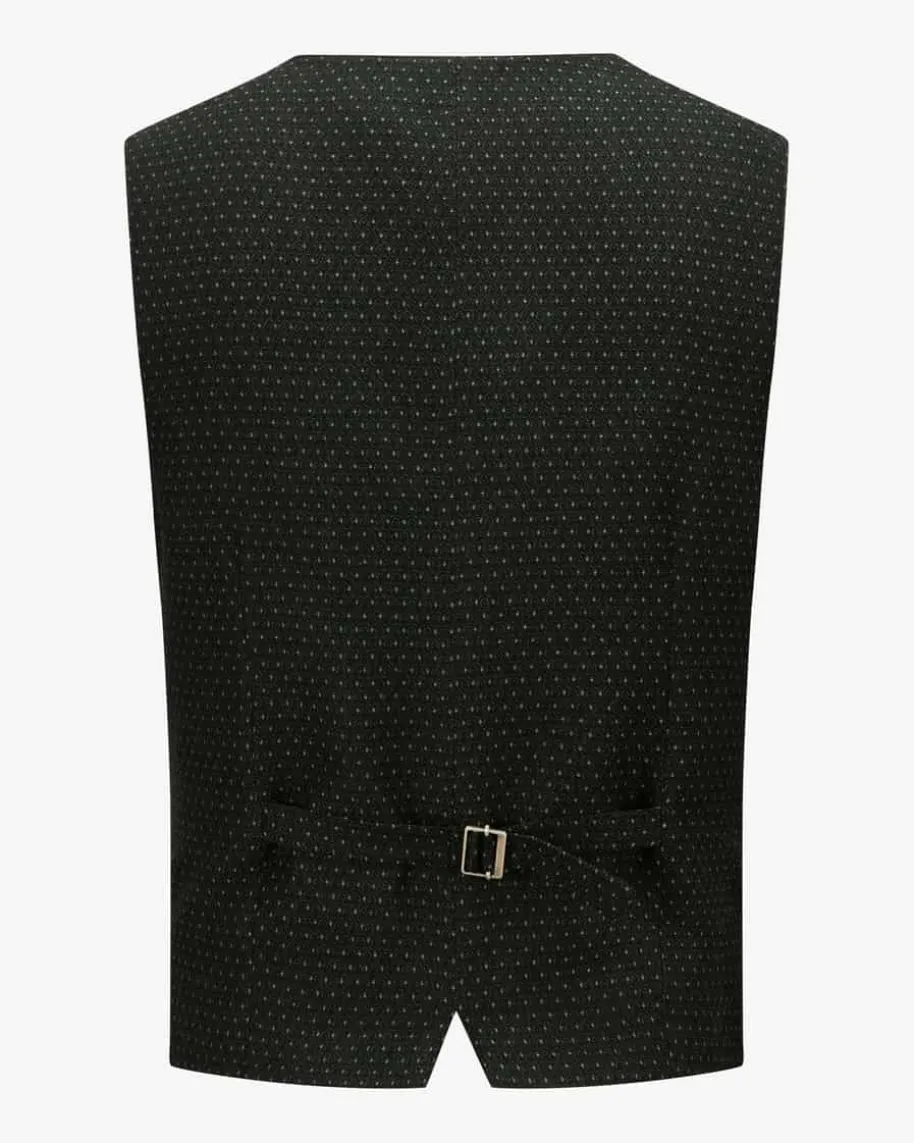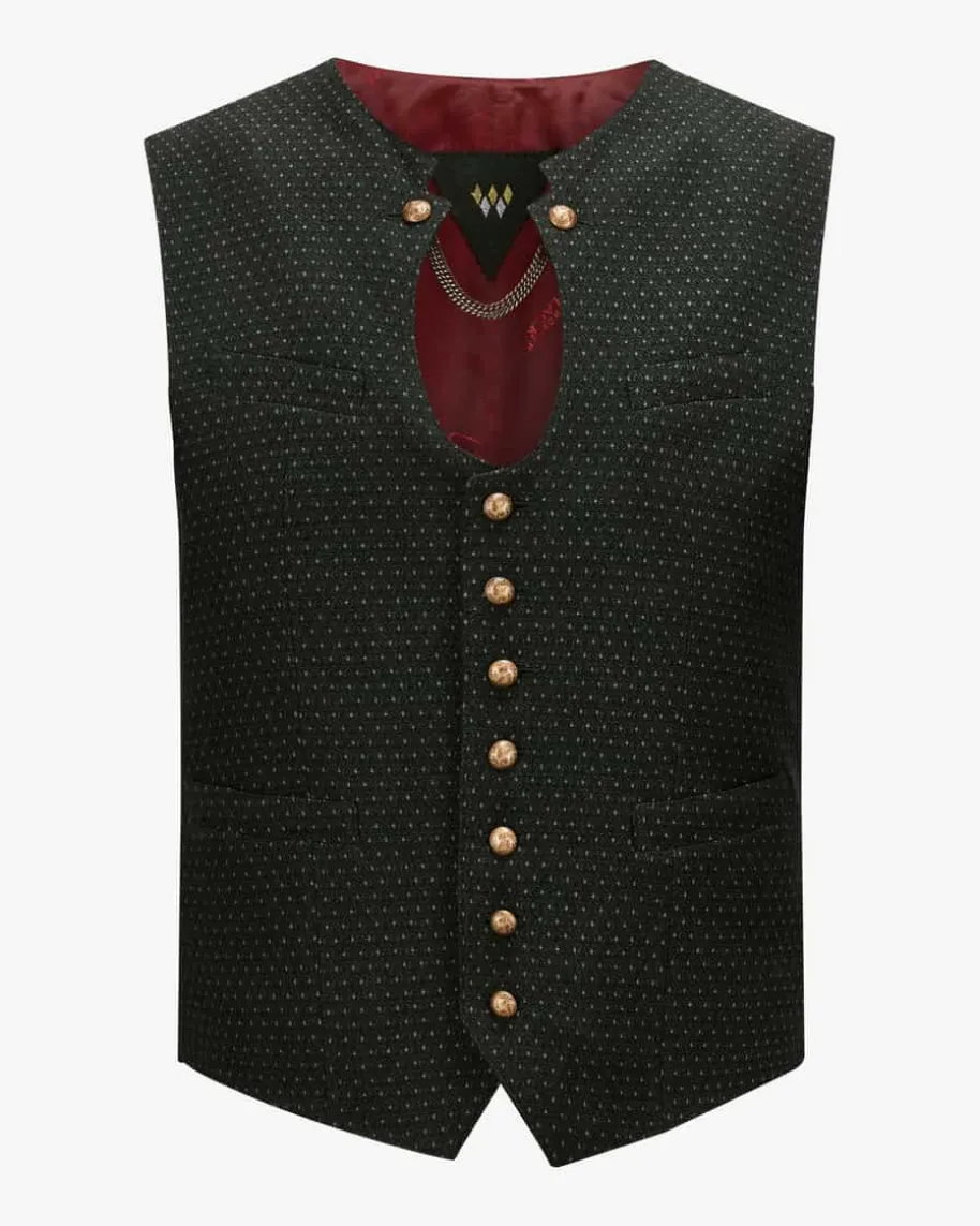 Klais Trachtenweste für Herren von Schorsch Hackl in Dunkelgrün und Schwarz. DasTrachten-Modell begeistert mit angenehmer Schurwoll-Qualität und feinemWebmuster in traditioneller Aufmachung, welche durch filigrane goldfarbeneKugelknöpfe sowie der Miesbacher Aufmachung mit Ketten-Applikation harmonischuntermalt wird.