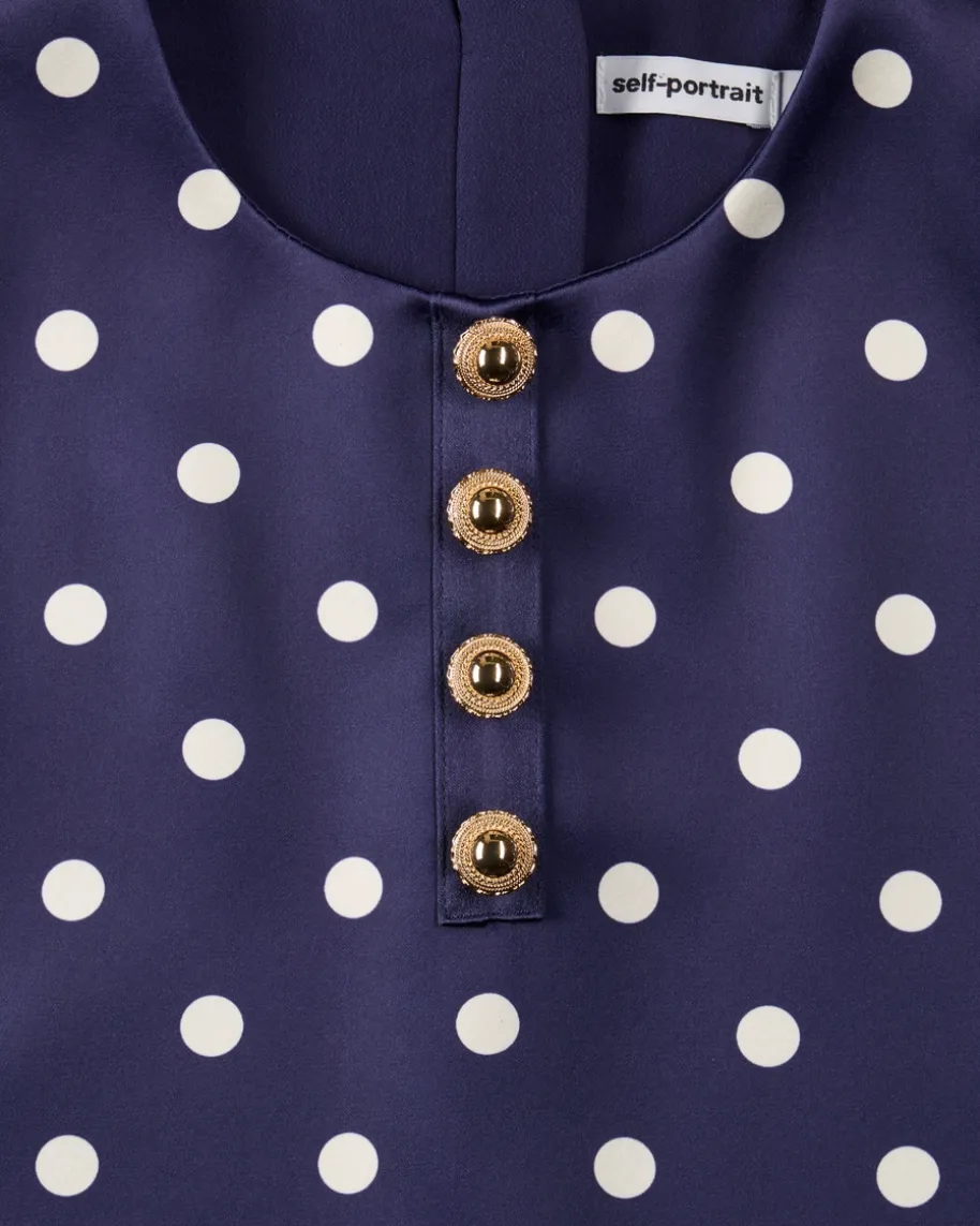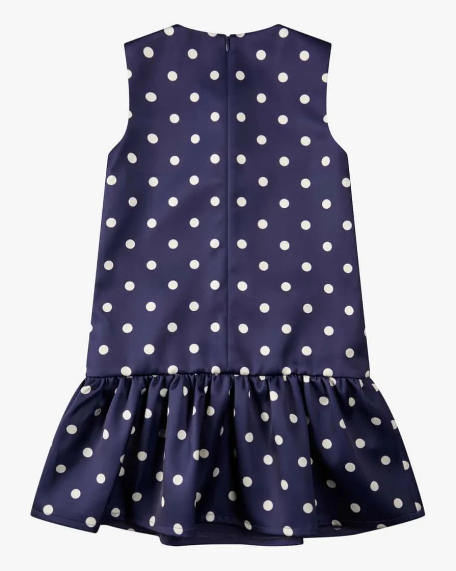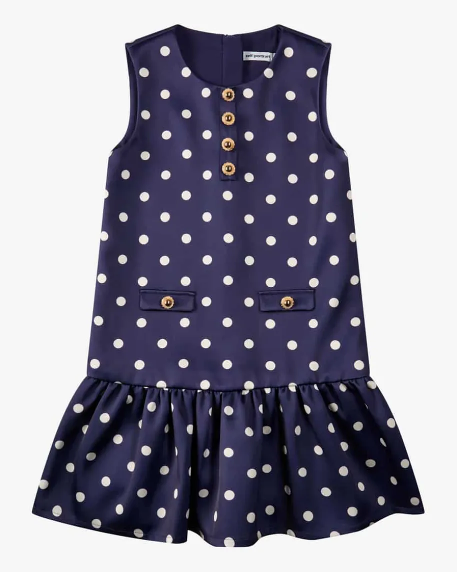 Kleid für Mädchen von Self-Portrait Kids in Violett und Weiß. Das Modellpräsentiert sich mit mädchenhaftem Volant-Rock und dekorativen, goldfarbenenKnöpfen, während die changierende Material-Qualität mit süßem Polkadot-Musterden Look elegant inszeniert.
