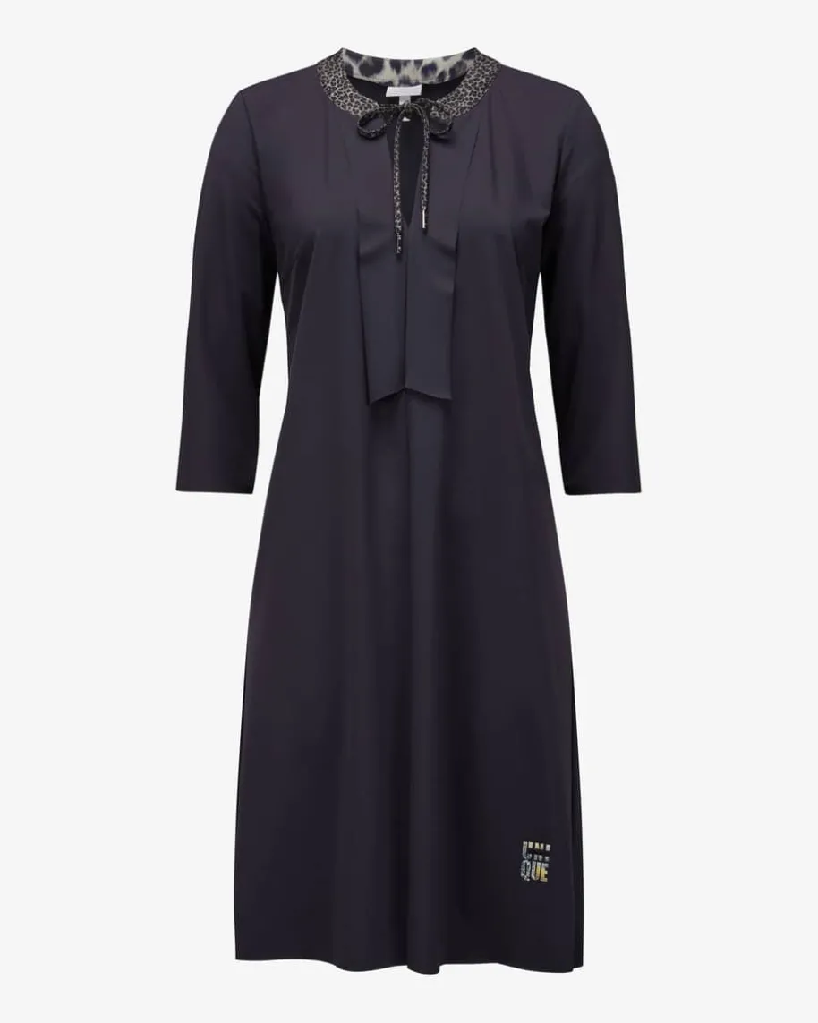 Kleid für Damen von Sportalm Emotion in Nachtblau, Beige und Schwarz. Das Modellüberzeugt mit elastischer und glatter Material-Qualität, die zusammen mit demmodischen Leo-Muster am Ausschnitt für einen femininen Charakter sorgt. DerTunika-Ausschnitt und feine Details runden den modischen Style gekonnt ab.