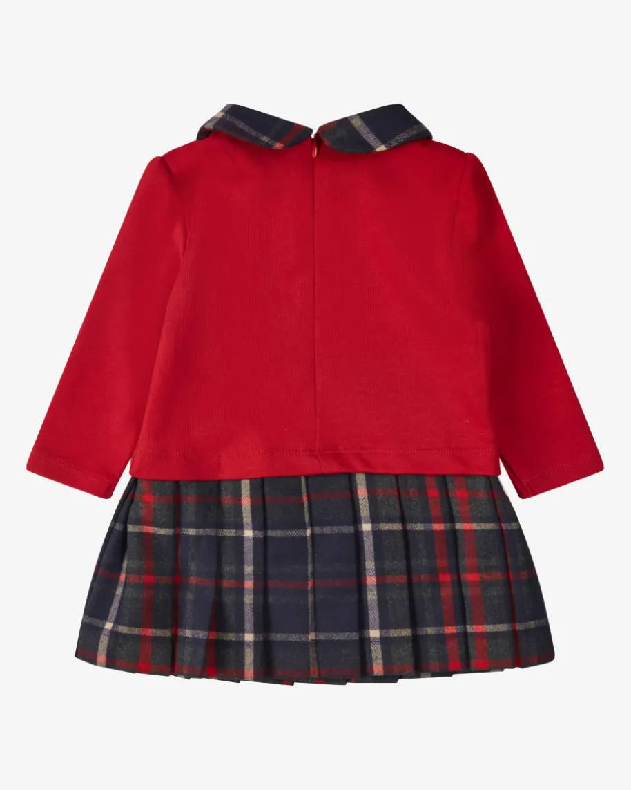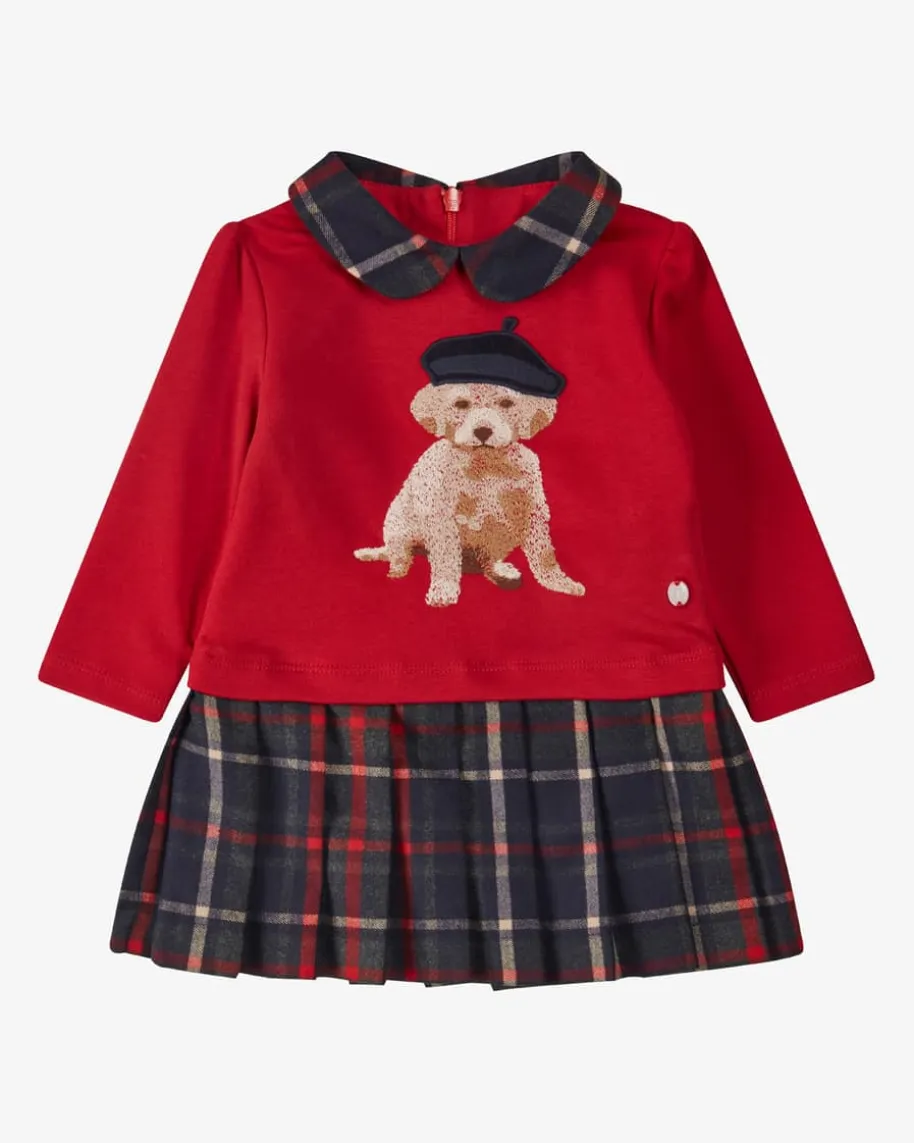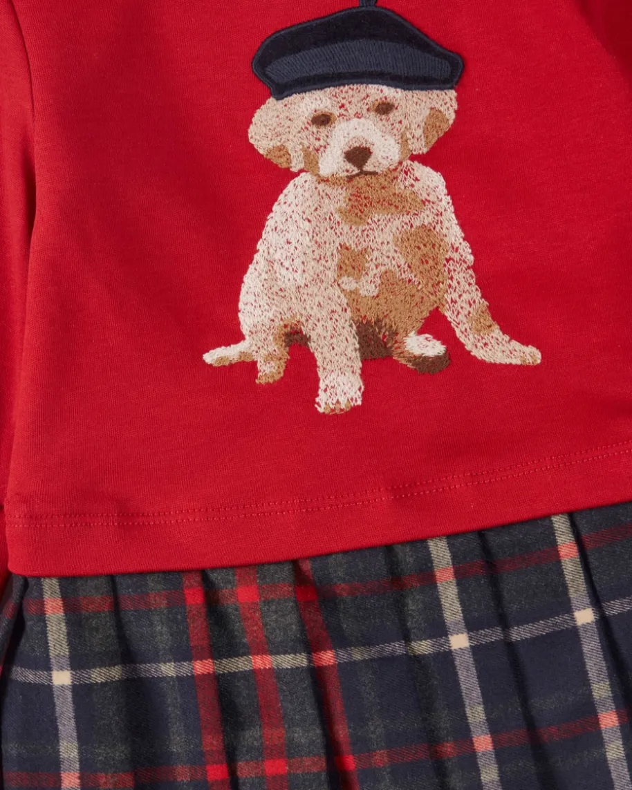 Kleid für Mädchen von Patachou in Rot, Dunkelblau und Beige. Das Modellpräsentiert sich mit raffiniertem 2-in-1 Look mit angesetztem Faltenrock undniedlichem Bubikragen, während die verspielte Stickerei mit Hunde-Motiv dasDesign im Brit Chic gekonnt abrundet.