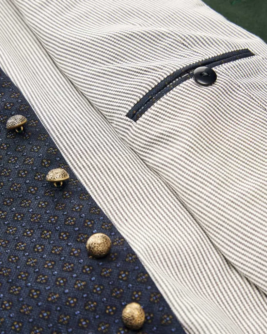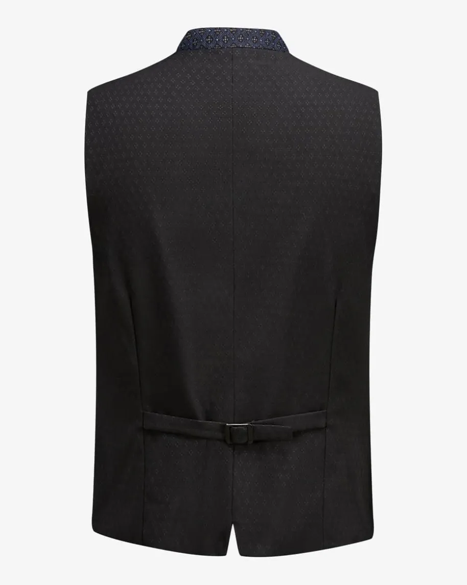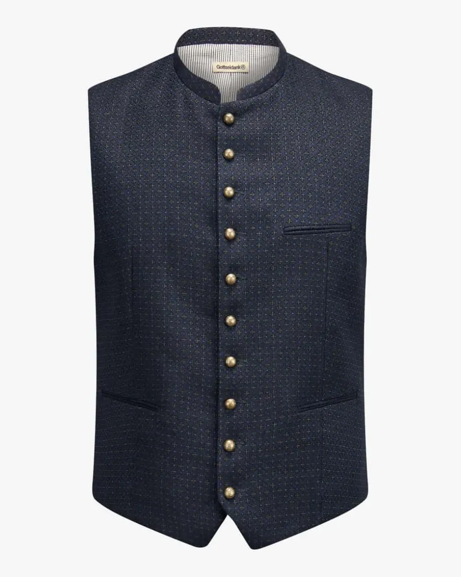 Konstantin Trachtenweste für Herren von Gottseidank in Nachtblau, Grau undSchwarz. Das Modell besticht durch die traditionelle Aufmachung mitstrukturiertem Medaillon-Muster, welche dank verzierter Kugelknöpfe stilvollunterstrichen wird – Ein edler Begleiter für besondere Trachten-Anlässe.