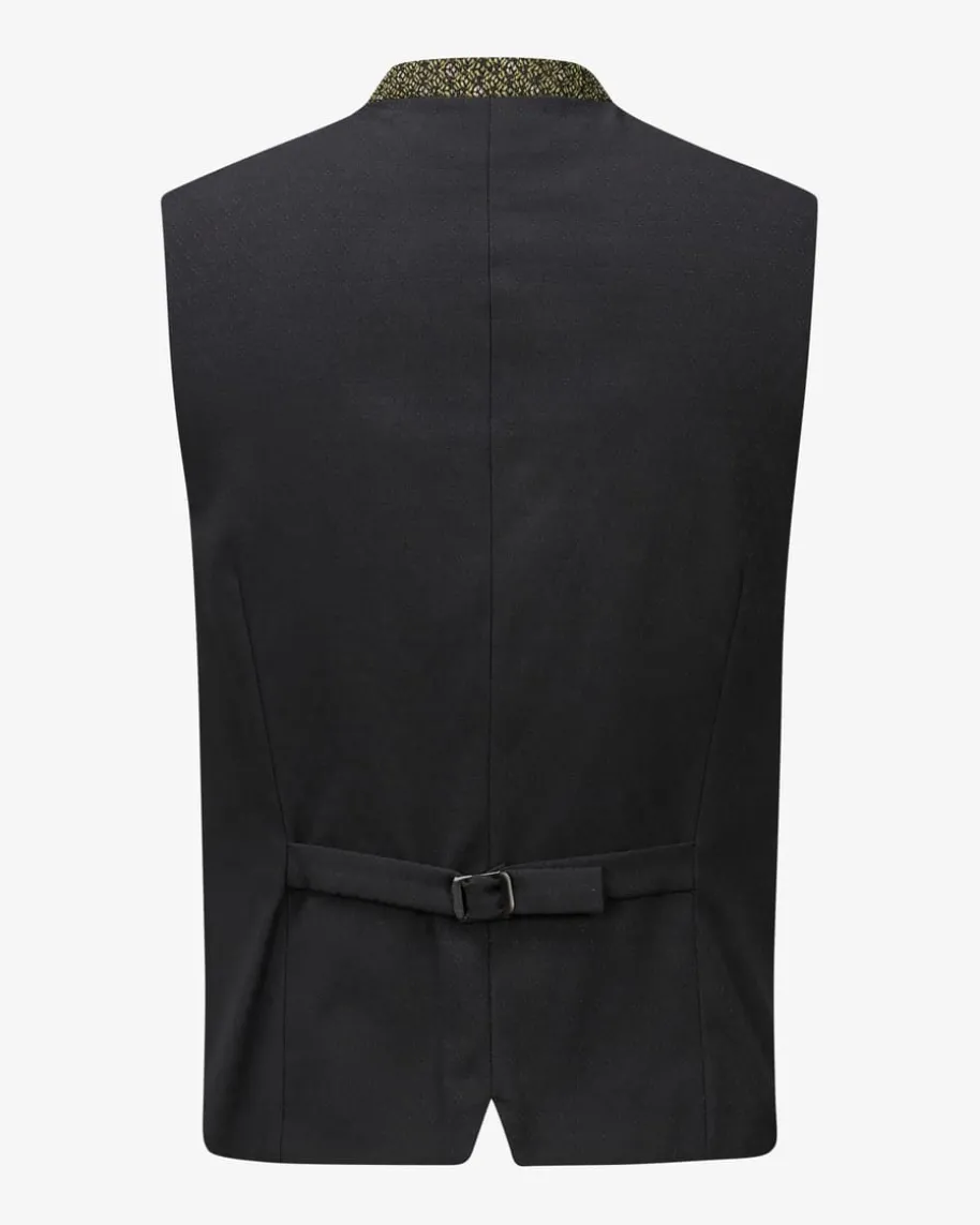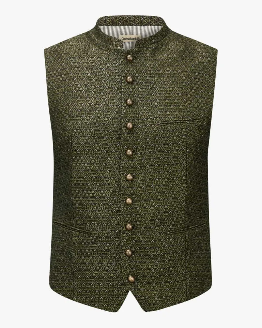 Konstantin Trachtenweste für Herren von Gottseidank in Moosgrün und Schwarz. DasModell begeistert mit traditioneller Aufmachung, welche dank filigranerKugelknöpfe und dem stilvollen Muster gekonnt unterstrichen wird. Zugleichergänzt der dezent elastische Rücken den Trachten-Look mit angenehmenTragemomenten.