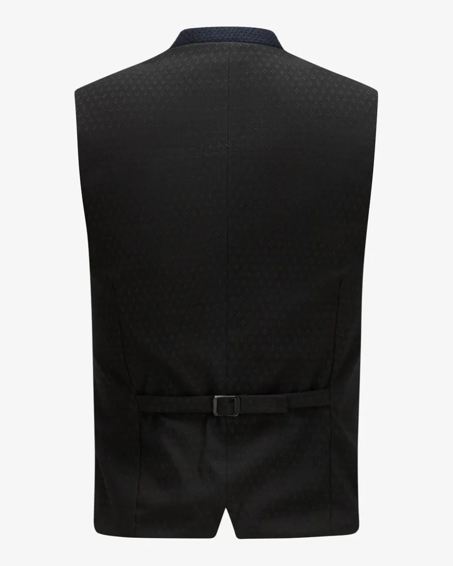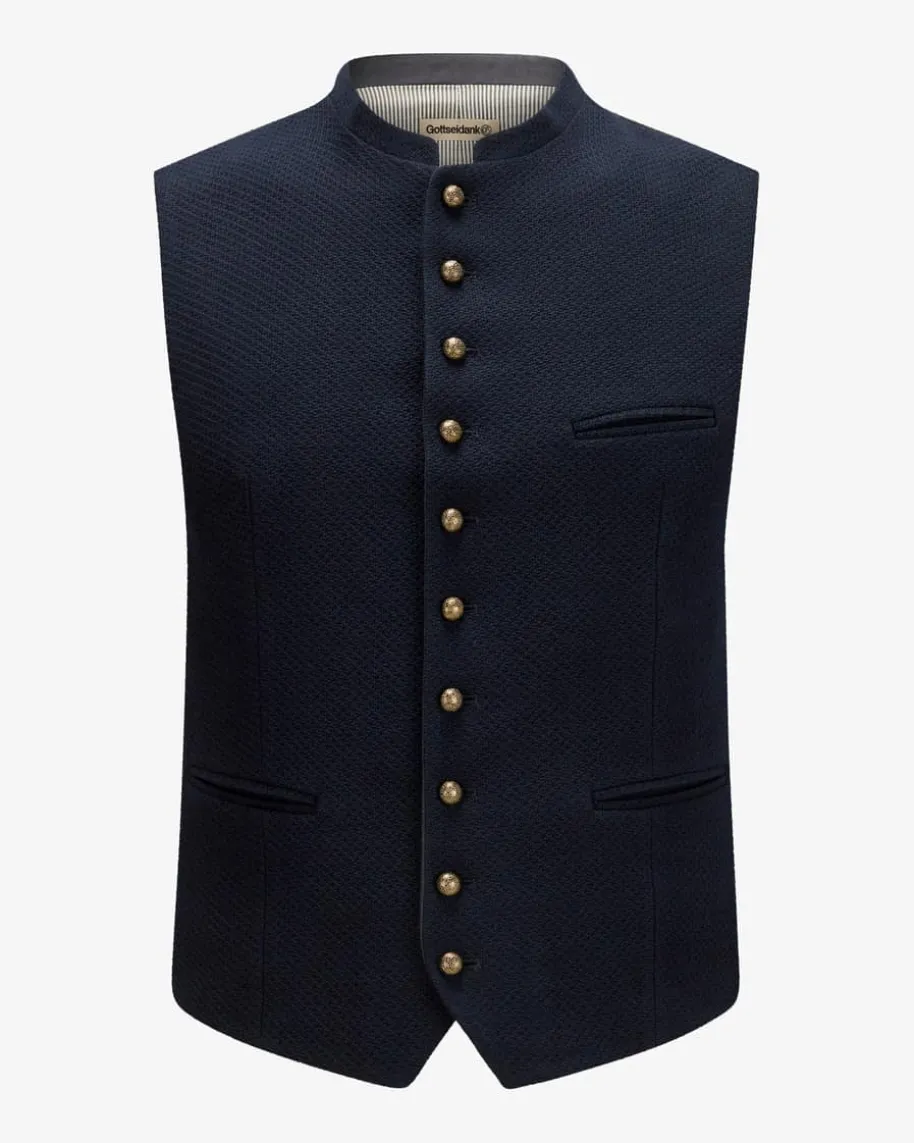 Konstantin Trachtenweste für Herren von Gottseidank in Nachtblau und Schwarz.Das Modell überzeugt durch die Kombination von zwei dezenten Dessins intraditioneller Aufmachung. Goldfarbene Kugelknöpfe und klassische Details rundendas Trachten-Design gekonnt ab.