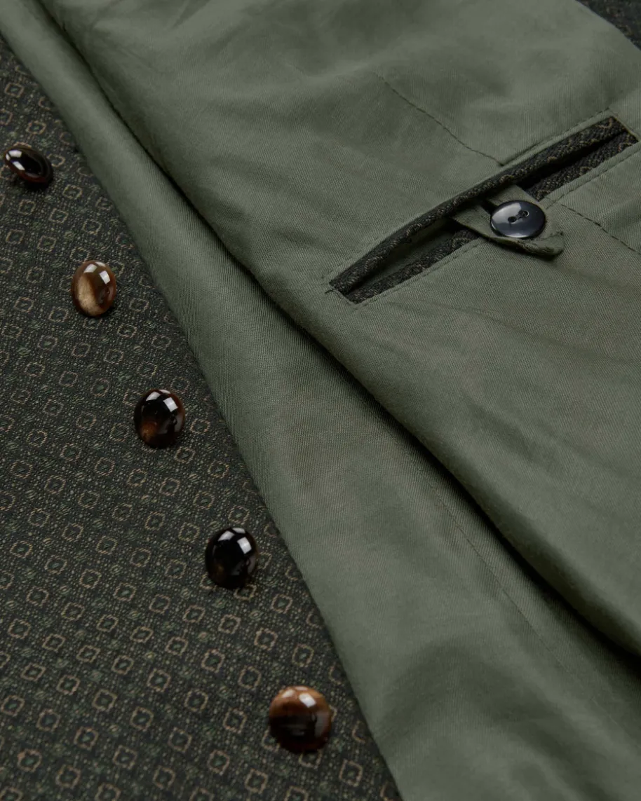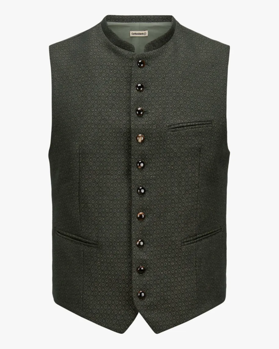 Konstantin Trachtenweste für Herren von Gottseidank in Dunkeloliv, Hellbraun undGraubraun. Das Modell überzeugt durch den hochwertigen Leinen-Baumwoll-Mix mitfeinem Webmuster sowie den gestreiften Rückenteil in traditioneller Aufmachungmit modernem Charme. Die changierenden Knöpfe runden das Trachten-Designstilvoll ab.