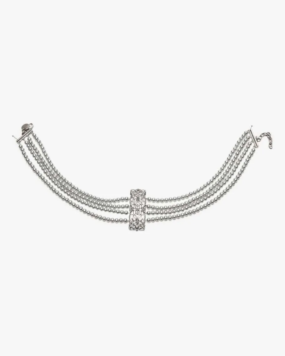 Kropfcollier für Damen von Seenberg Lifestyle in Silber und Hellgrau. ModernerTrachtenschmuck – Mit viel Liebe zum Detail wird jede Seenberg Kreation vonIngrid Aigner-Schatz designt. Dieses Halsschmuckstück mit vierreihigerPerlenkette und vergoldetem Ornament avanciert zum optischen Highlight jedesTrachten-Looks.