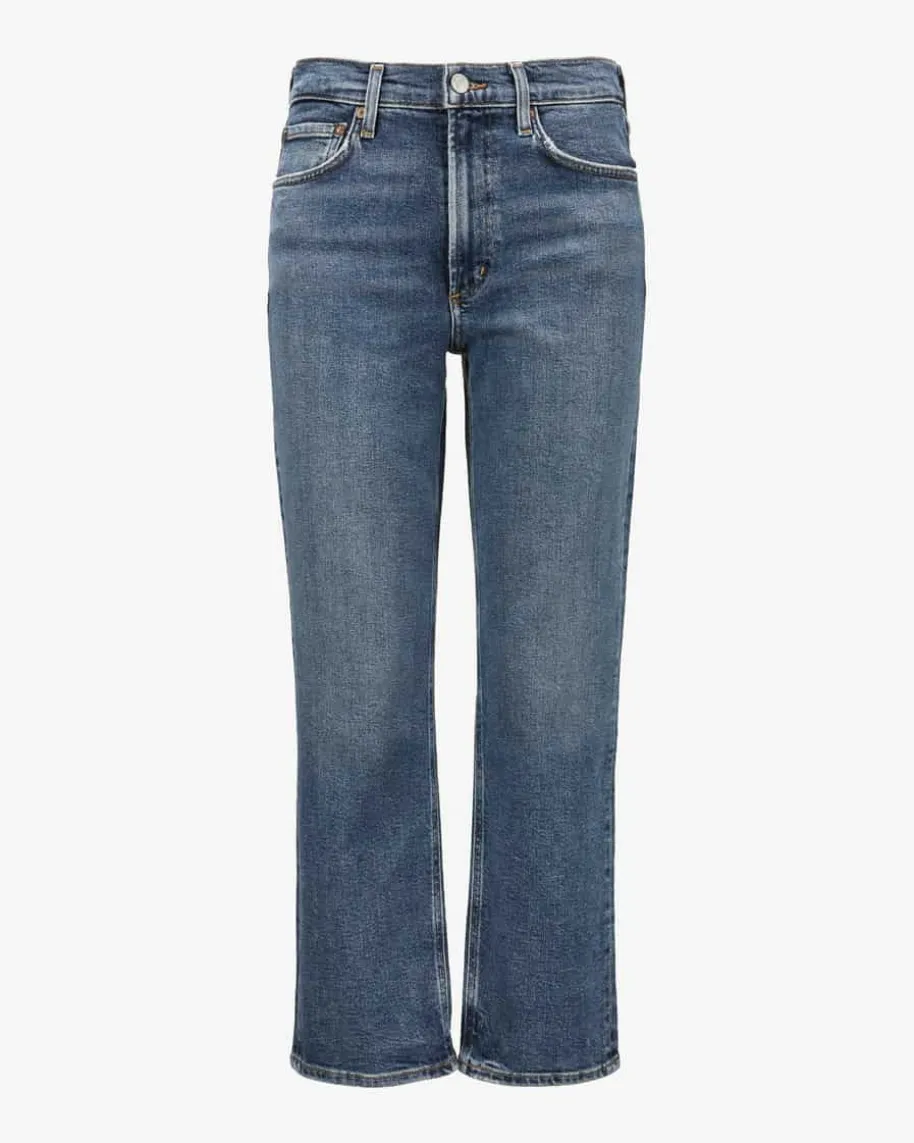 Kye 7/8-Jeans für Damen von Agolde in Blau. Das verkürzte Modell in festerDenim-Qualität überzeugt mit charakteristischer Raw-Waschung, während der geradeSchnitt sowie dezente Destroyed-Details für einen legeren Twist sorgen.