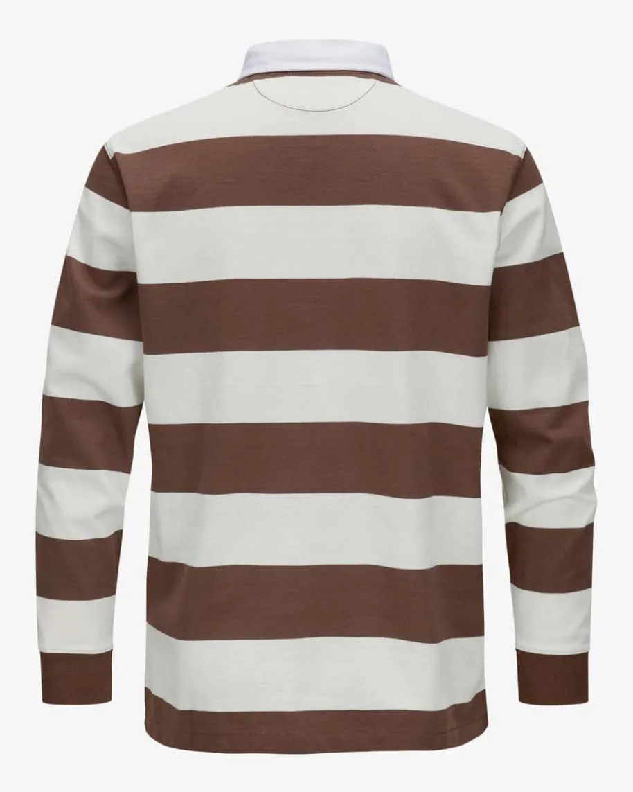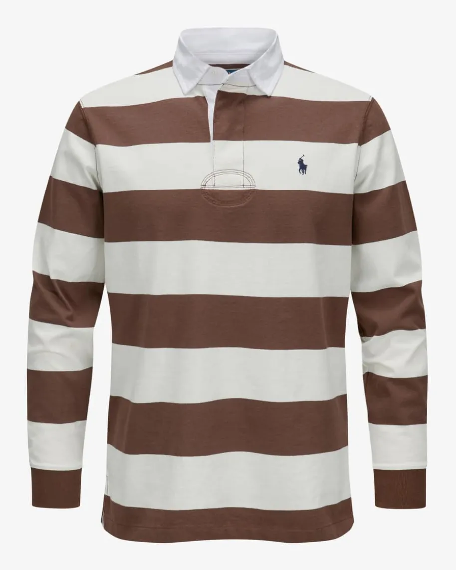 Langarm-Polo für Herren von Polo Ralph Lauren in Braun und Weiß. Das geradegeschnittene Rugby aus angenehmer Baumwolle erweist sich dank modischemStreifen-Dessin als legerer Favorit, während der Polo-Kragen mit verkürzterKnopfleiste, Rippstrick-Details als auch die charakteristische Logo-Stickereidas Gesamtbild klassisch ergänzen.