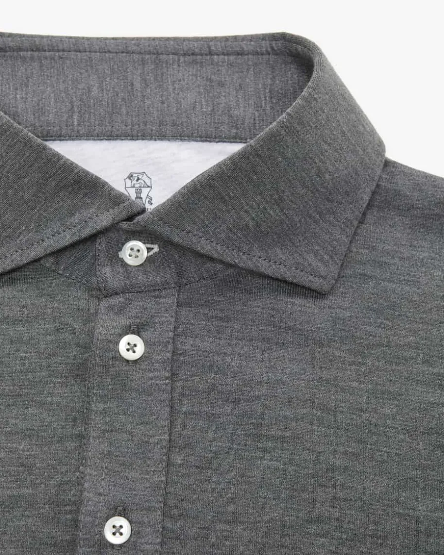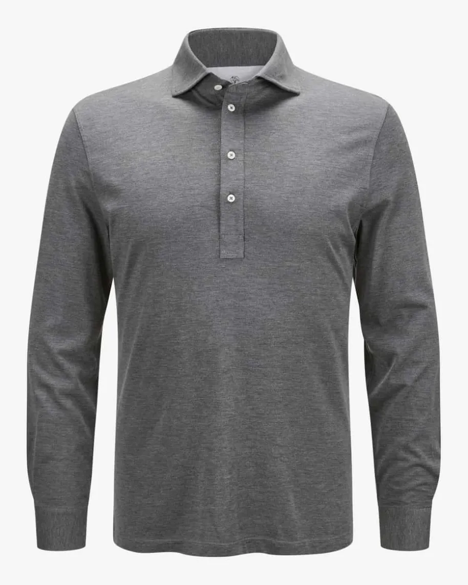 Langarm-Polo für Herren von Brunello Cucinelli in Anthrazit. Das Modell bestichtdankder angenehmen Seiden-Baumwoll-Qualität mit einem weichen Griff, während dasschlichte Design einen vielseitigen Favoriten für modische Looks kreiert.