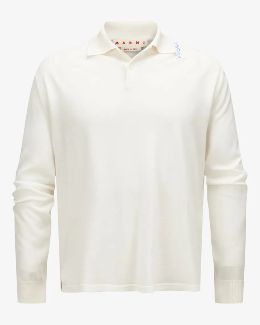 Langarm-Strickpolo für Herren von Marni in Creme. Luxuriöse Prêt-à-porter Stylesund ein einzigartiges Geschick für Farb- und Musterexperimente: Das ist dieEssenz der Luxusbrand Marni, welche die Kollektionen so begehrenswert undeinzigartig macht. Das Modell besticht durch die feine, semitransparente Woll-Strickverarbeitung mit leichtem Tragegefühl, während der Polokragen zusammen mitdem kontrastierenden Logo-Stick einen modernen Pullover mit besonderem Touchkreieren.