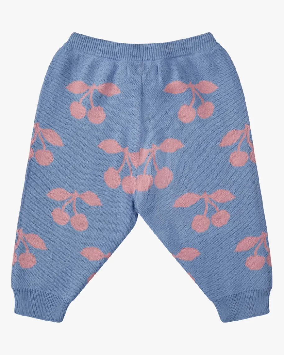 Lapis Strickhose für Babys von Konges Slojd in Hellblau und Rosa. Das Modellpunktet mit dem hochwertigen Jacquard-Muster mit süßem Kirschen-Motiv, währenddie legere Passform mit elastischen Rippstrick-Bündchen den Style gekonntabrundet.