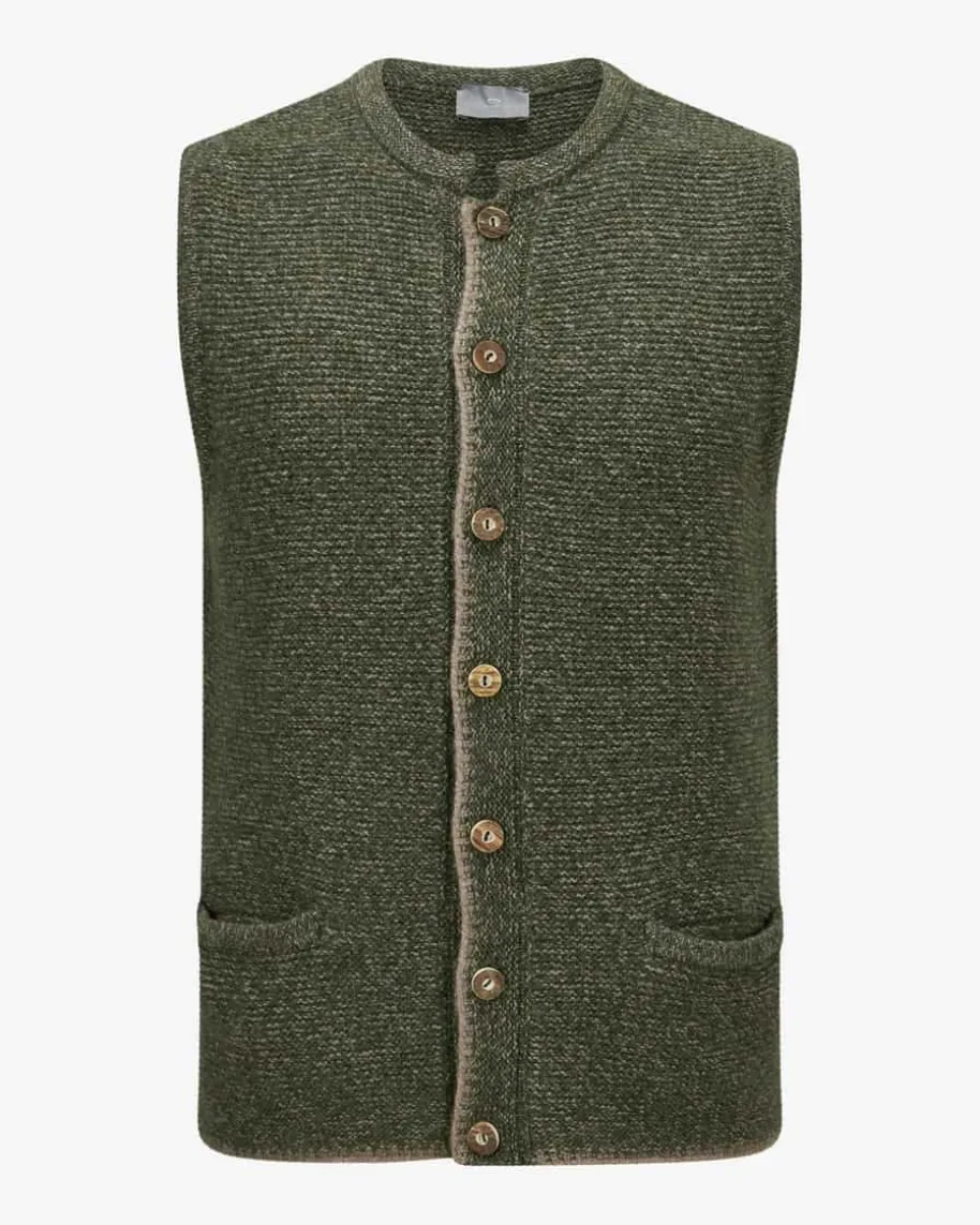 Lauper Trachten-Strickweste für Herren von LODENFREY in Dunkelgrün. DieStrickweste aus hochwertigem Cashmere-Woll-Mix präsentiert sich intraditioneller Aufmachung. Das Modell zeichnet sich durch das zeitloseStrickmuster aus, während klassische Details sowie die Hornknöpfe das Gesamtbildmit traditioneller Note vollenden.