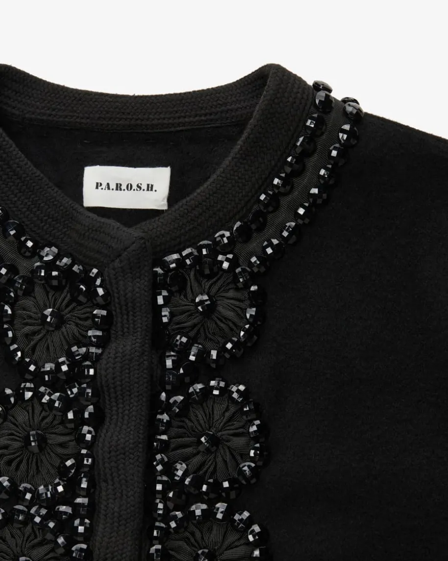 Leak25 Jacke aus Wolle für Damen von Parosh in Schwarz. Die Marke steht fürverspielte Designs mit Vintage-Flair – farbenfrohe Prints, Glitzer und Retro-Vibes made in Italy. Das Modell in modischer Aufmachung punktet sowohl mithaptischen als auch optischen Highlights dank der Verarbeitung aus weicher Wolleund den handbestickten Schmucksteinen, die einen Hingucker für edle Lookskreiert.