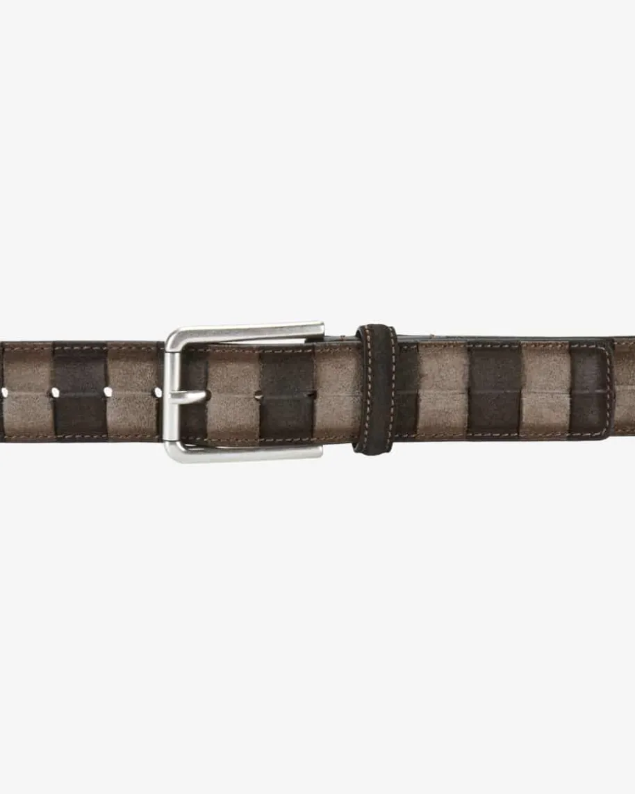 Ledergürtel für Herren von Veneta Cinture in Dunkelbraun und Hellbraun. Daszweifarbige Modell, gefertigt aus hochwertigem Velourleder, präsentiert sichdank der markanten Dornschließe in maskuliner Aufmachung, während dieraffinierte Flecht-Optik modische Akzente setzt.