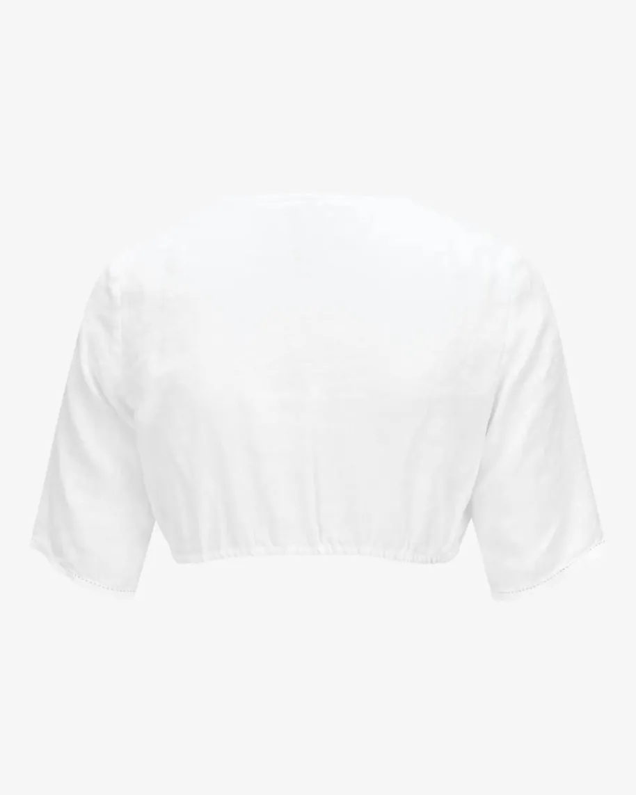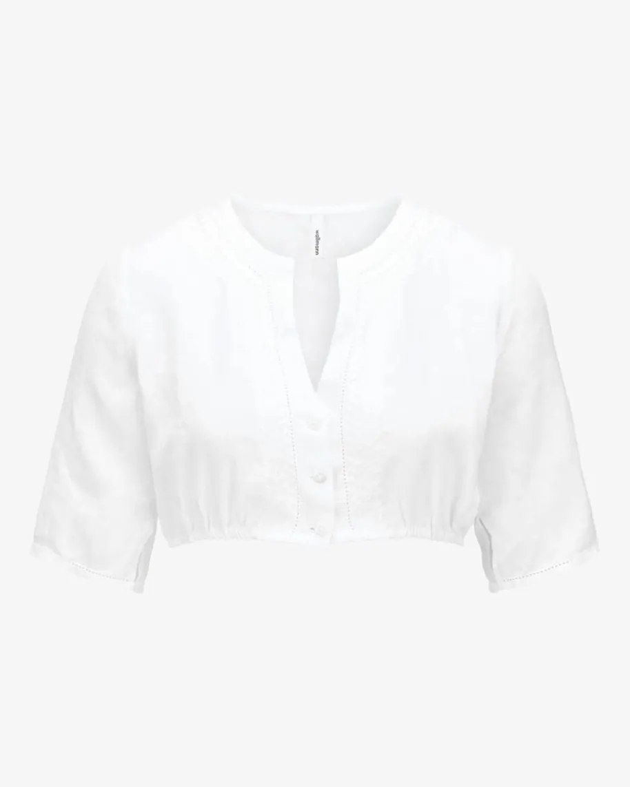 Leinen-Dirndlbluse für Damen von Wallmann in Weiß. Das Modell überzeugt dankleichter Leinen-Qualität sowohl haptisch als auch optisch, während die ¾-Ärmelmit feinen Lochstickereien sowie die tonalen Zierstickereien entlang desAusschnitts besondere Akzente setzen.