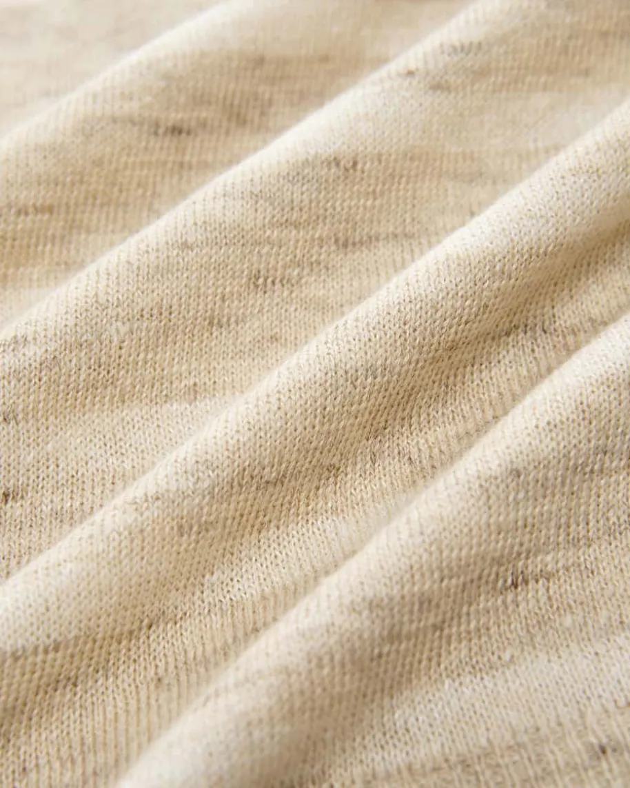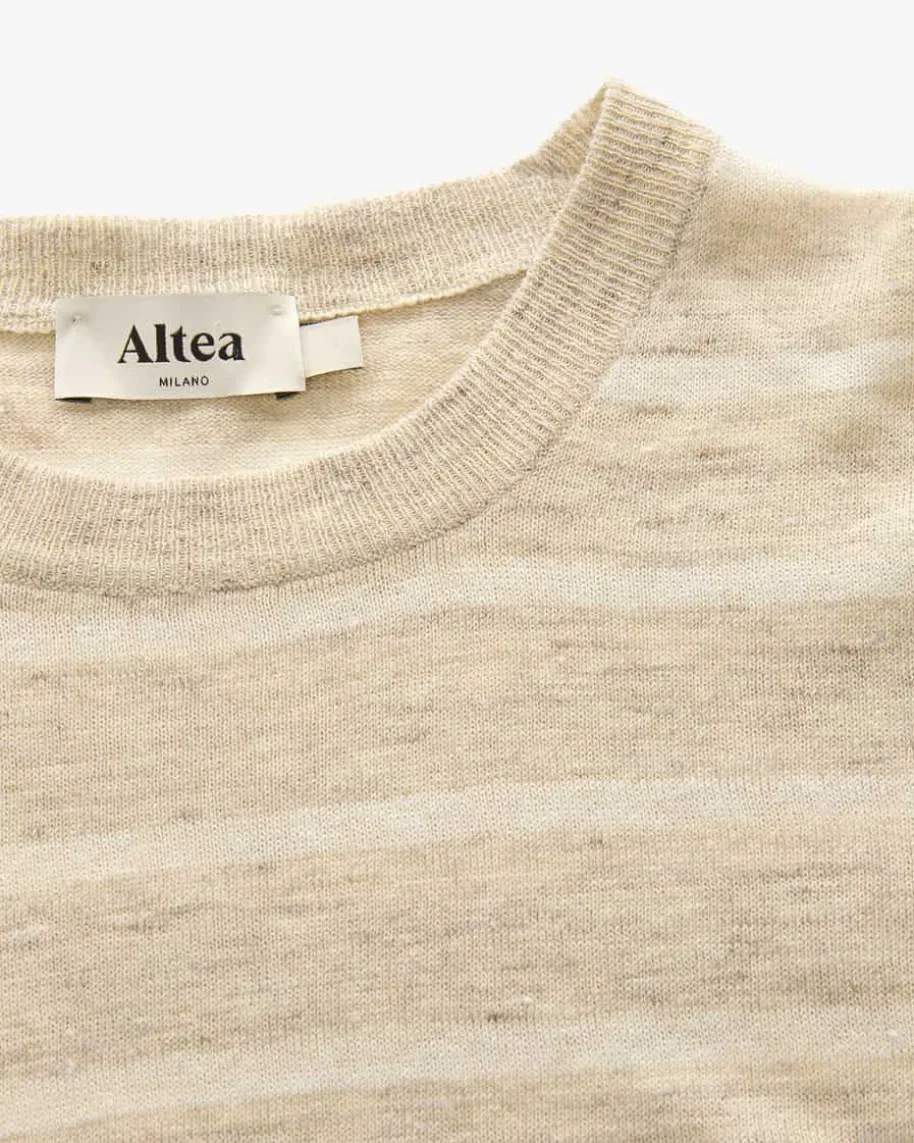 Leinen T-Shirt für Herren von Altea in Natur und Creme. Dieses sommerliche Basicpräsentiert sich in schlichter Aufmachung sowie strukturierter Leinen-Baumwoll-Qualität, während die natürliche Material-Optik und das Streifen-Dessin den Lookmodisch vollenden.