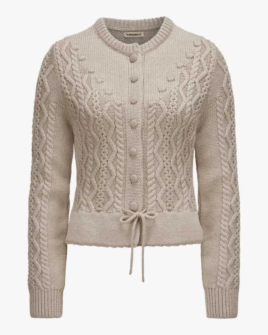 Lene Trachten-Strickjacke für Damen von Gottseidank in Beige. Die extrafeineMerino-Wolle in raffinierter Strick-Qualität punktet mit besonders angenehmemTragekomfort, während tonale, stoffbezogene Knöpfe sowie der Tunnelzug dastraditionelle Modell feminin vollenden.