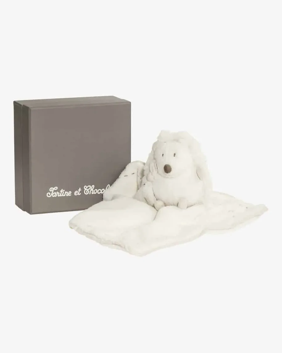 Léon Plüschtier Igel mit Tuch von Tartine et Chocolat in Creme. Léon ist ein kuscheliger Spielgefährte ebenso für kleine wie für große Kinder. Mit seinem flauschigen Fell ist das Stofftier ein toller Schmusepartner. Neben den süßen Ohren verstärken auch die Füße und Hände die niedliche Optik. Ein an den Igel fixiertes Schmusetuch mit Logo-Stickerei und Paspelierung sorgt für viel Spaß beim Kuscheln und Greifen. Inklusive der passenden Geschenkschachtel ist das Kuscheltier immer eine besonders gelungene Überraschung und somit das perfekte Geschenk, zum Beispiel für Geburtstage oder die Taufe.