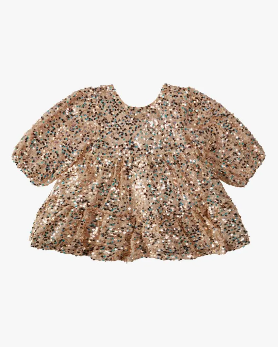 Lila Paillettenkleid für Babys von Konges Slojd in Gold. Das Modell punktet mitchangierender Pailletten-Verarbeitung, die einen einzigartigen Hingucker-Lookgarantiert. Die ausgestellte Passform mit süßen Volants rundet den edlen Lookharmonisch ab.