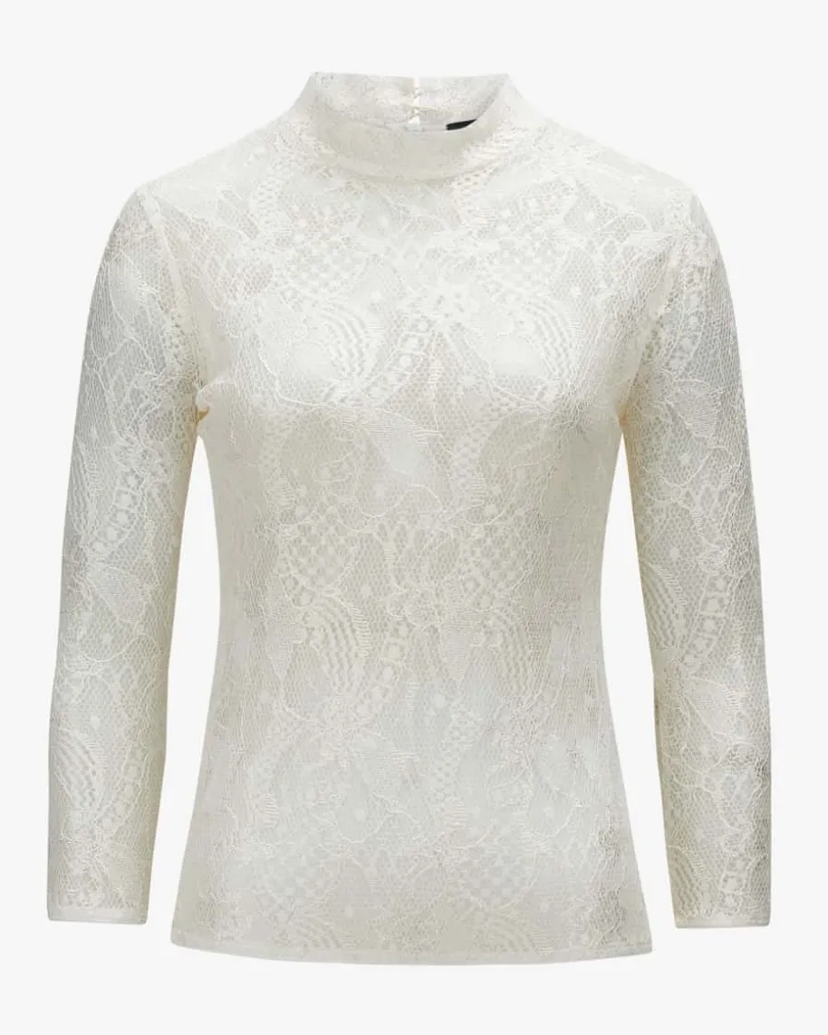 Lina Spitzenbluse für Damen von Kinga Mathe in Creme. Das taillierte,hochgeschlossene Modell zeichnet sich durch die transparente Spitzen-Qualitätaus, welche dank feiner Paspelierungen stilvoll ergänzt wird. Auch zum Dirndleignet sich das Piece dank klassischer Details als stilsichere Wahl.
