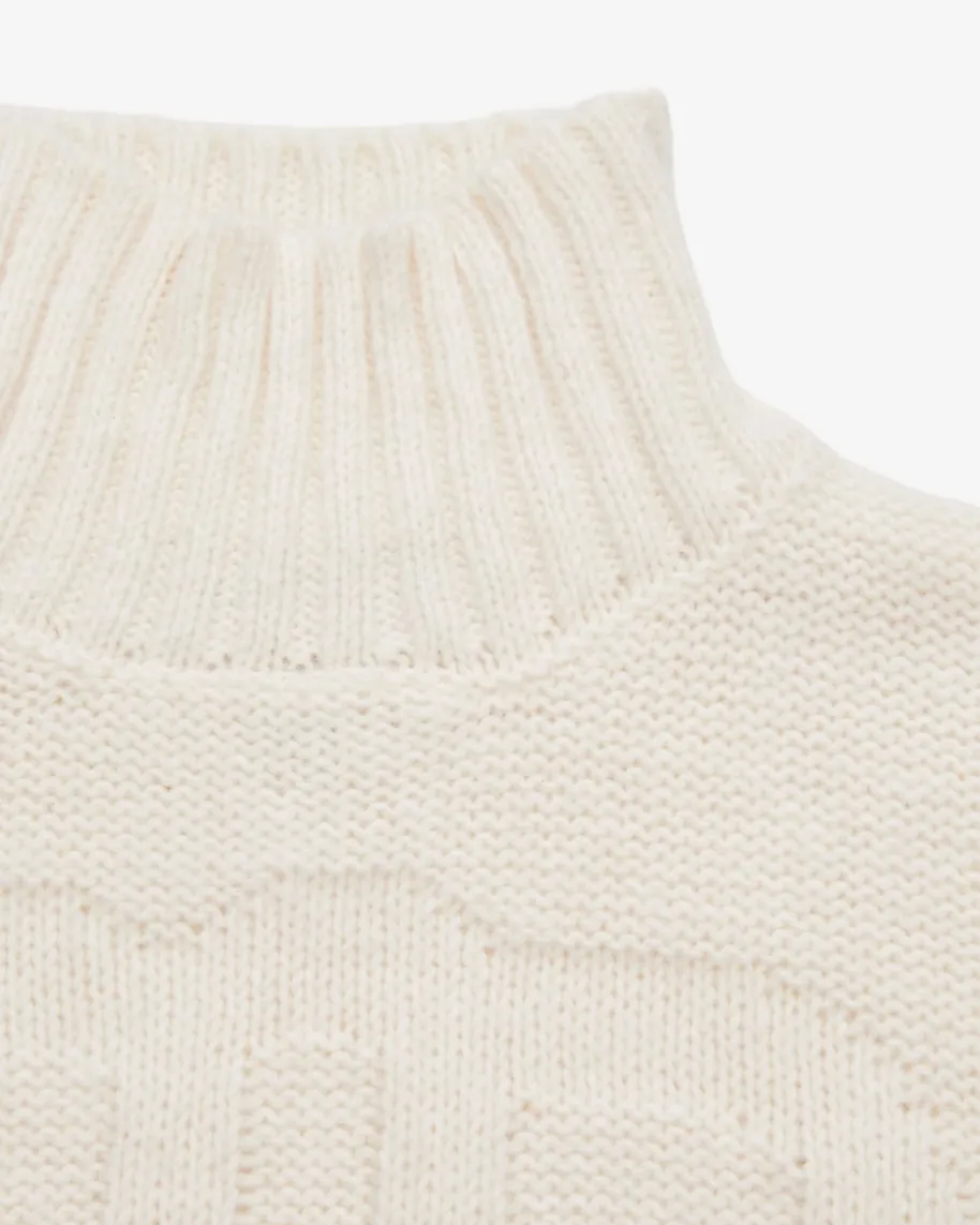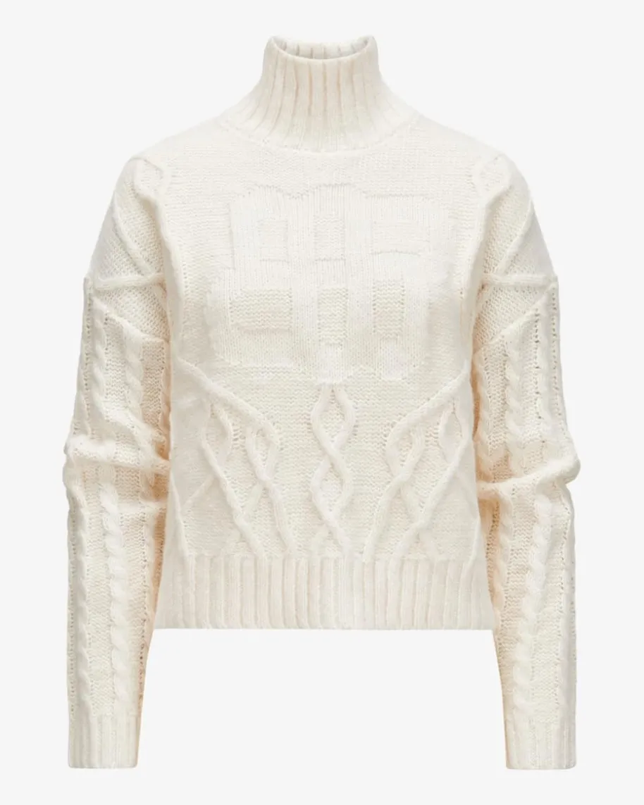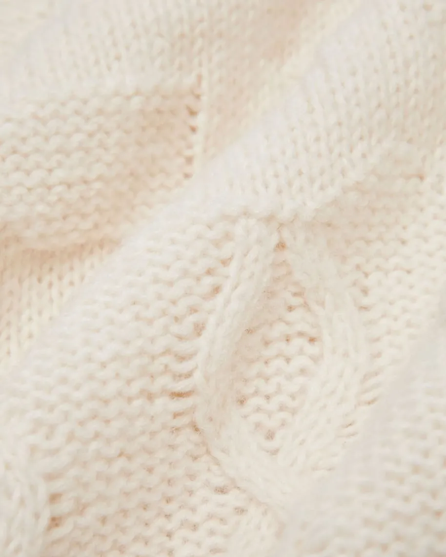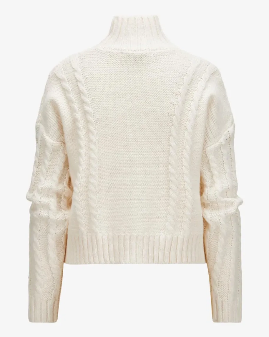 Loganberry Pullover für Damen von Munthe in Creme. Das skandinavische Label ausKopenhagen – feminin & cool. Auch dieses Modell präsentiert sich mit markantemZopfstrickmuster und weicher Material-Mix, der angenehmen Tragekomfortgarantiert. Die weite Silhouette mit Stehkragen und breiten Rippstrick-Detailsschafft einen legeren Style inspiriert vom klassischen Country-Look.