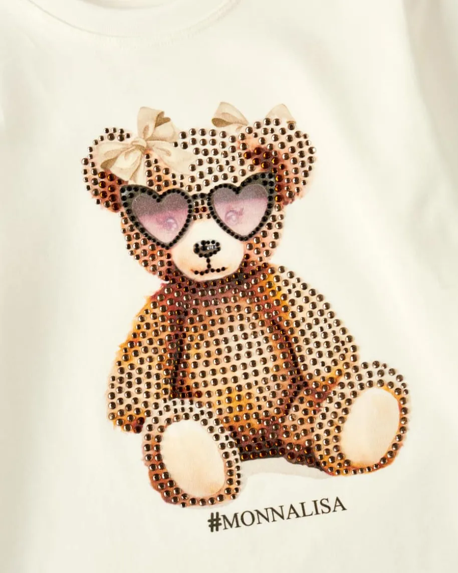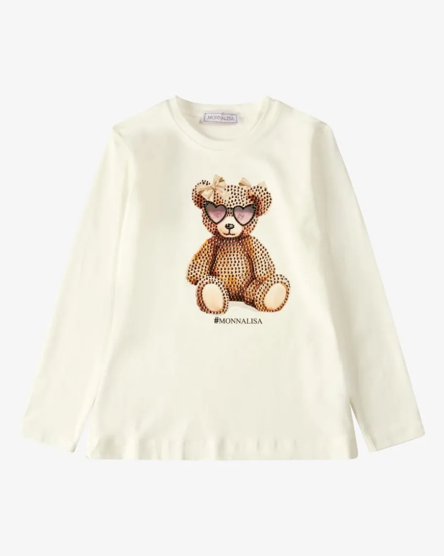 Longsleeve für Mädchen von Monnalisa in Weiß, Braun und Schwarz. Das Modellpräsentiert sich in verspielter Aufmachung dank des niedlichen Bären-Print mitSonnenbrille, während die changierenden Glitzersteine für das gewisse Etwassorgen.