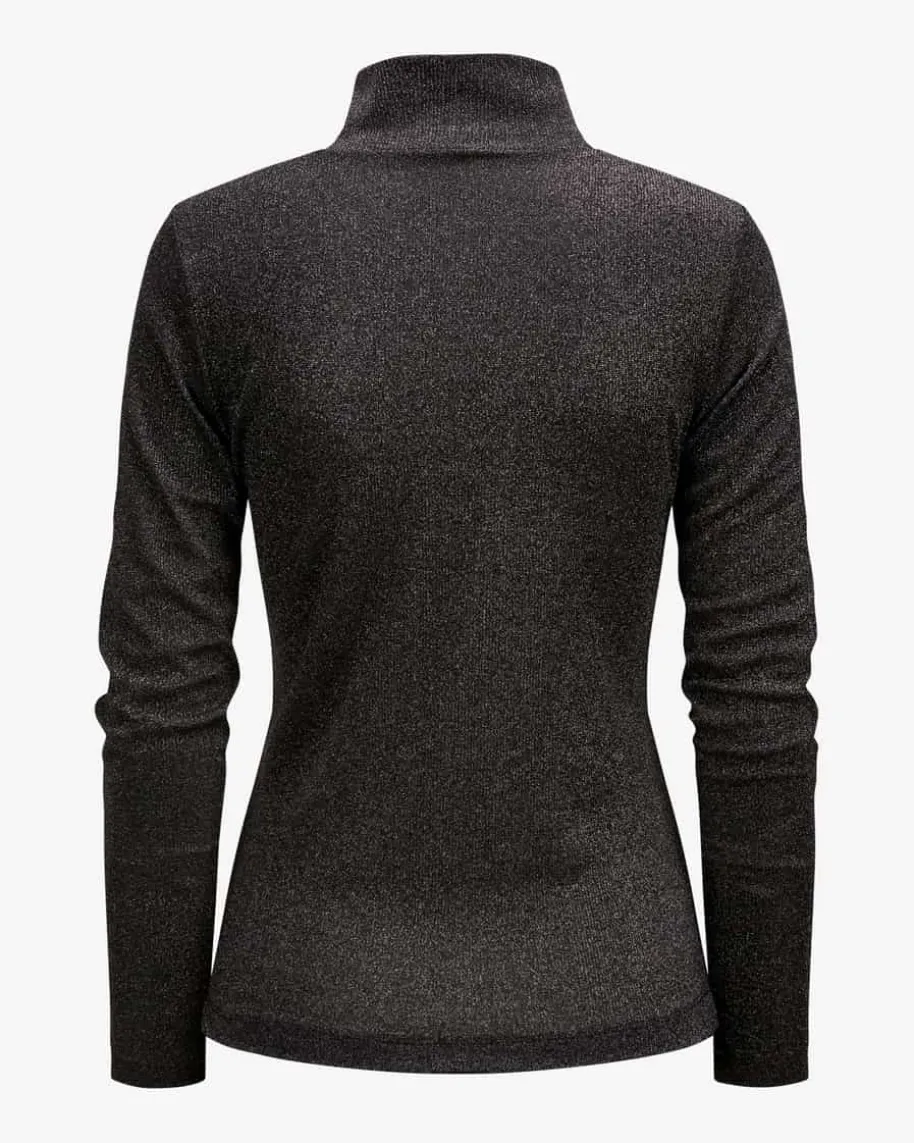 Longsleeve für Damen von Marc Cain in Schwarz. Das Modell präsentiert sich infemininer Silhouette, während die Rippstrick-Struktur in Kombination mit denmetallisierten Fasern sowohl einen sportiven als auch eleganten Favoritenversprechen.