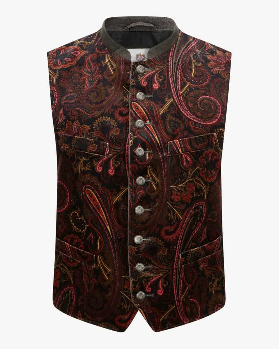 Lorenz Trachten-Weste für Herren von Meindl in Oxblood. Das Modell aushochwertigem Material-Mix mit leicht elastischer Woll-Rückseite präsentiert sichin traditionellem Charme, welcher dank der Münzknöpfe sowie der Samt-Aufmachungstilvoll untermalt wird. Zugleich setzt das Paisley-Muster besondere Akzente.