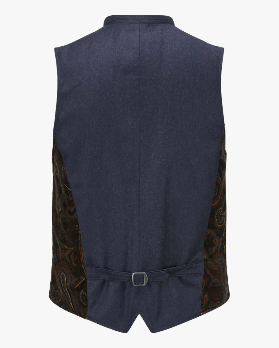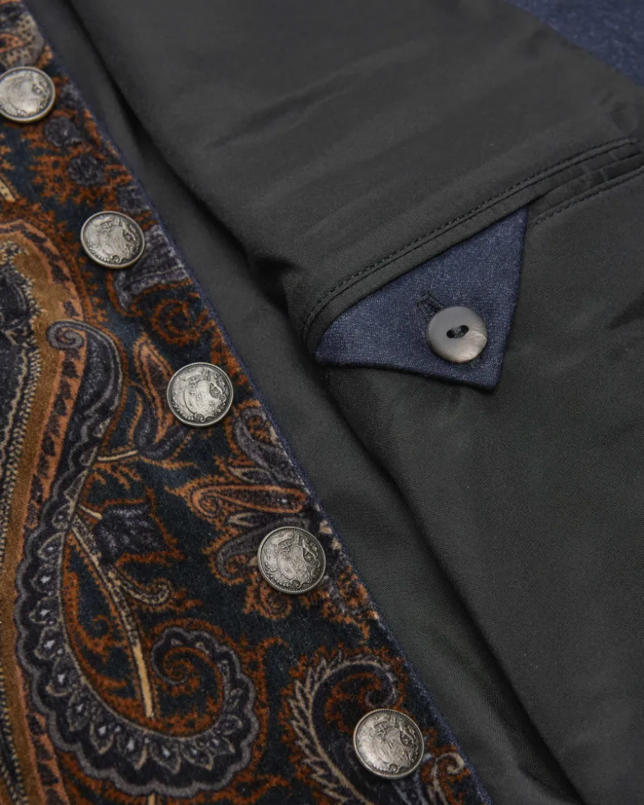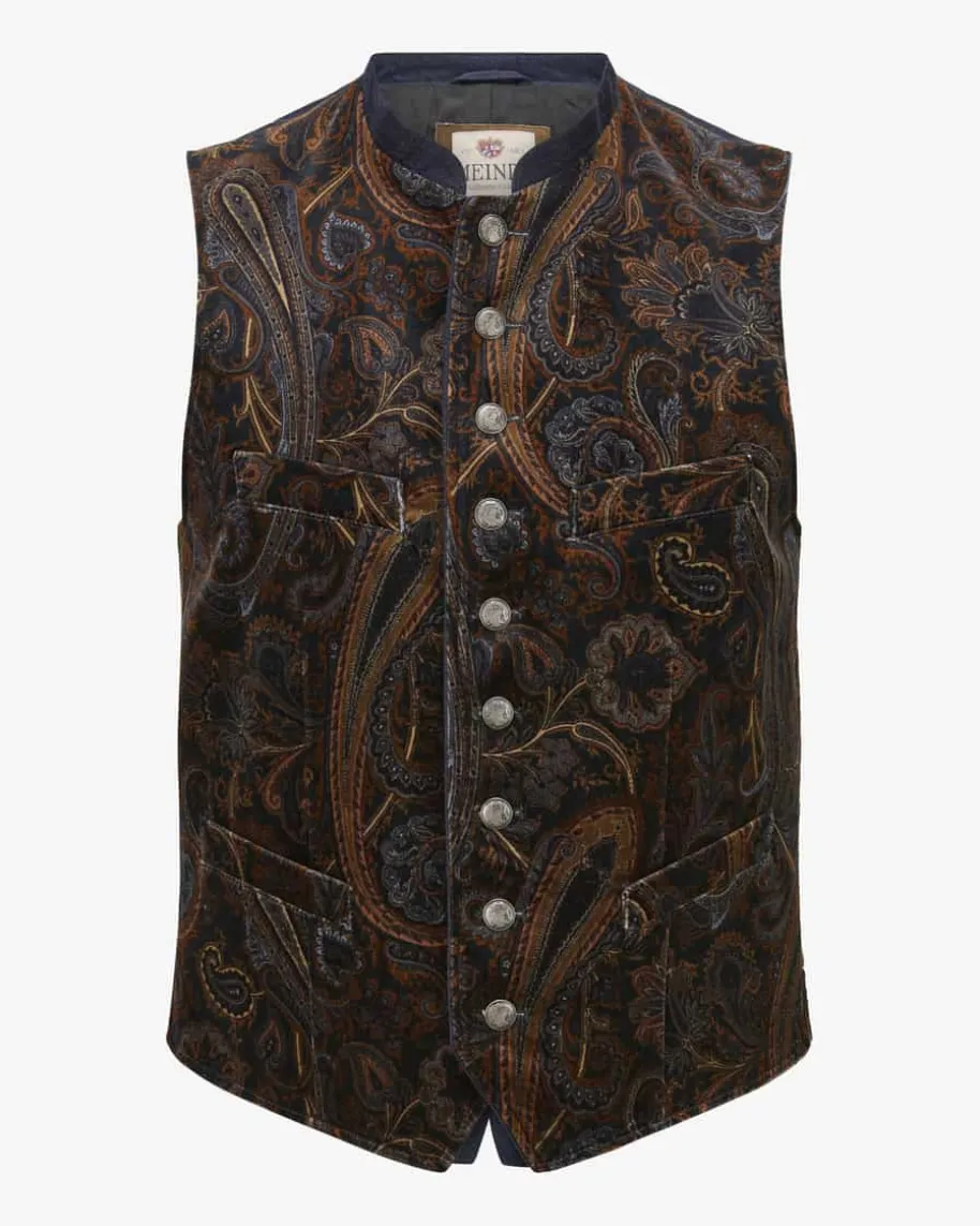 Lorenz Trachten-Weste für Herren von Meindl in Midnight Navy. Das Modell aushochwertigem Material-Mix mit leicht elastischer Woll-Rückseite präsentiert sichin traditionellem Charme, welcher dank der Münzknöpfe sowie der Samt-Aufmachungstilvoll untermalt wird. Zugleich setzt das Paisley-Muster besondere Akzente.