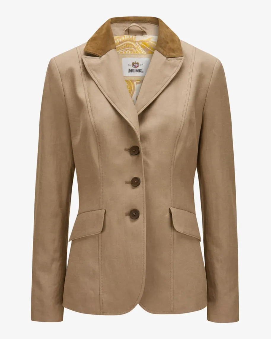 Lyon Trachten-Blazer für Damen von Meindl in Latte. Das traditionelle Modellüberzeugt durch zeitlose Eleganz in hochwertiger Baumwoll-Leinen-Qualität. Diefeminine Passform und tonigem Leder-Besatz runden den Trachten-Style harmonischab.