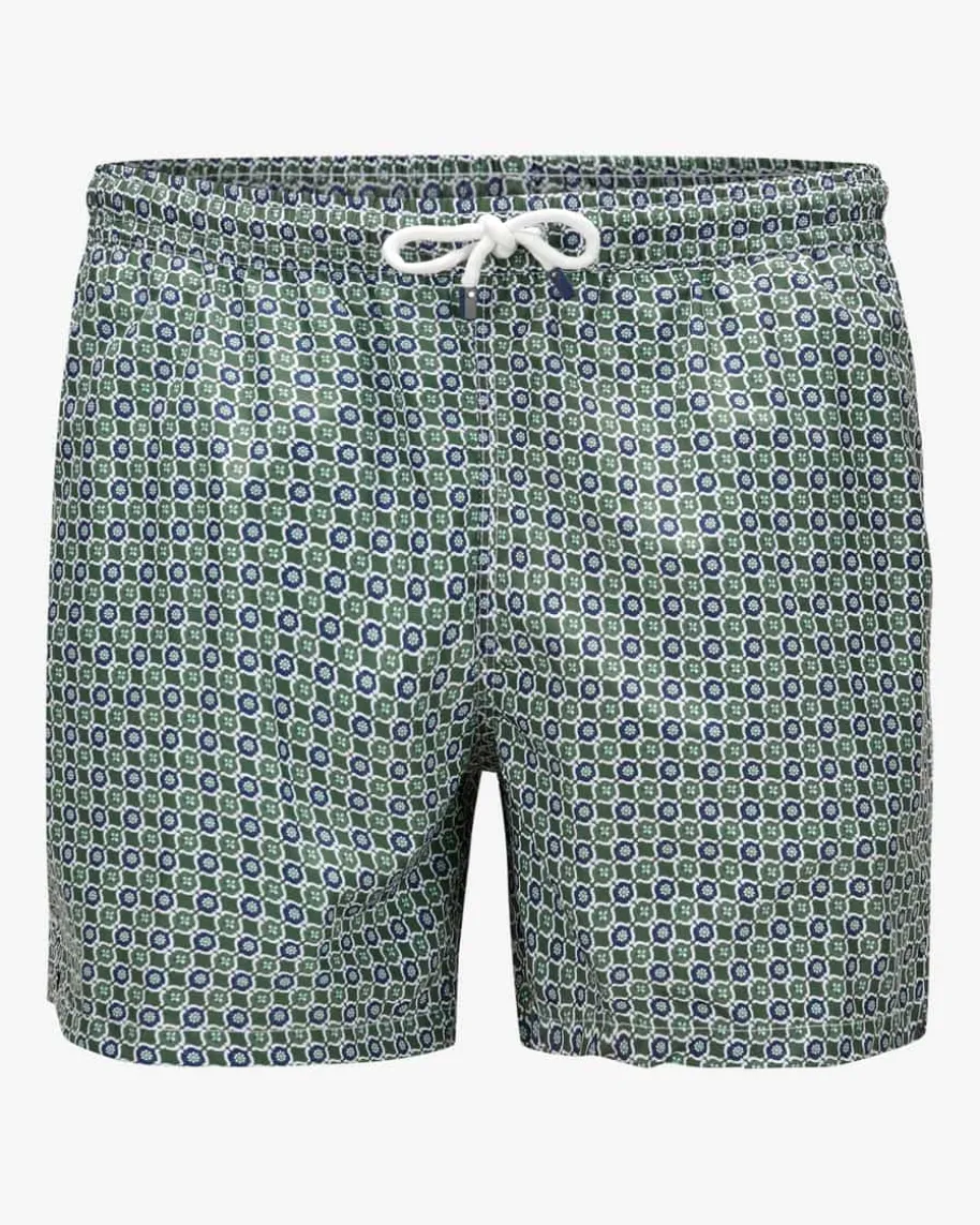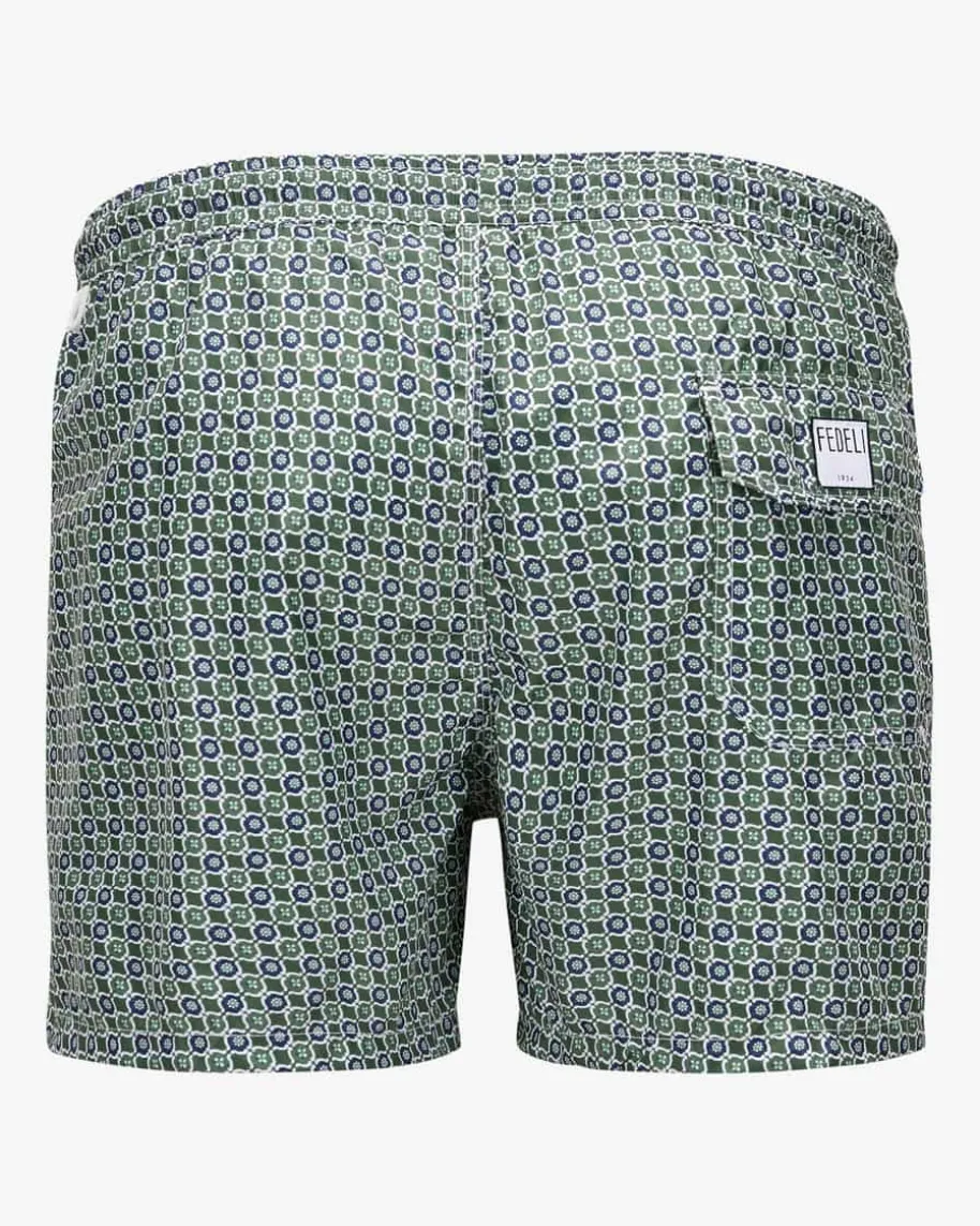 Madeira Badeshorts für Herren von Fedeli in Dunkelgrün, Navy und Weiß. DasAllover-Dessin sowie sportive Details kreieren einen legeren Look, während dankdem leichten Material sowie der Mesh-Innenhose ein perfekter Begleiter fürentspannte Tage an Pool oder Strand geschaffen wird.