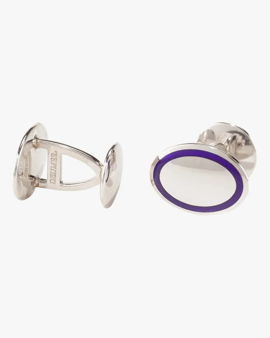Manschettenknöpfe für Herren von Deumer in Silber und Dunkelblau. Klassisch undelegant präsentieren sich die in Deutschland handgefertigten Manschettenknöpfein ovaler Form. Für eine modische Note sorgt die kontrastierende CloisonnèeGlasemaille.
