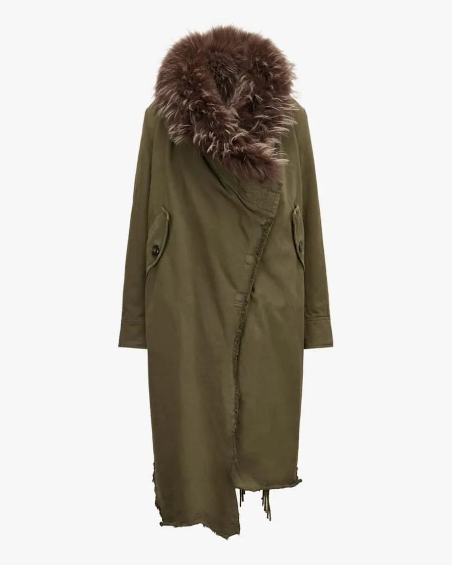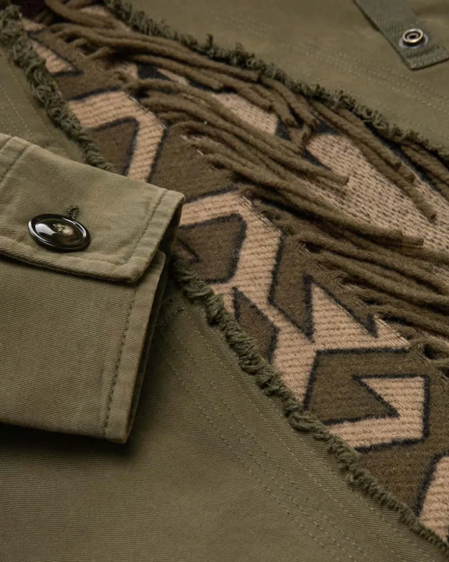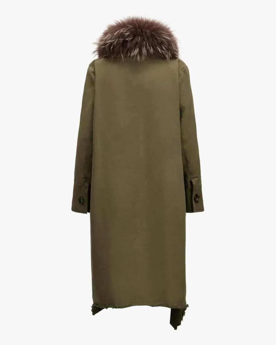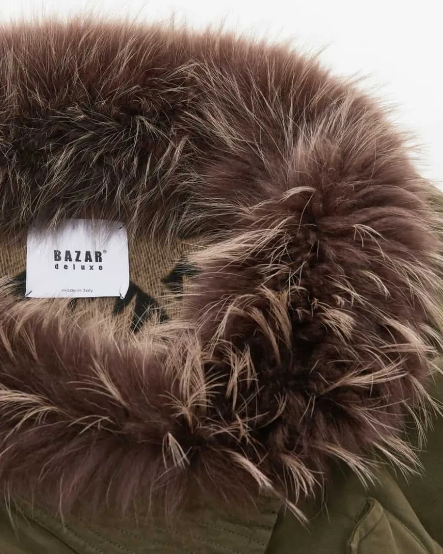 Mantel für Damen von Bazar Deluxe in Oliv und Braun. Das 2-in1-Modell inOversize-Aufmachung überzeugt dank dem raffinierten Schnitt als kombistarkerBegleiter, welcher durch das abtrennbare Cape mit Pelzkragen sowie Fransen-Details und grafischem Ethno-Muster individuelle Looks für Sie bereithält.