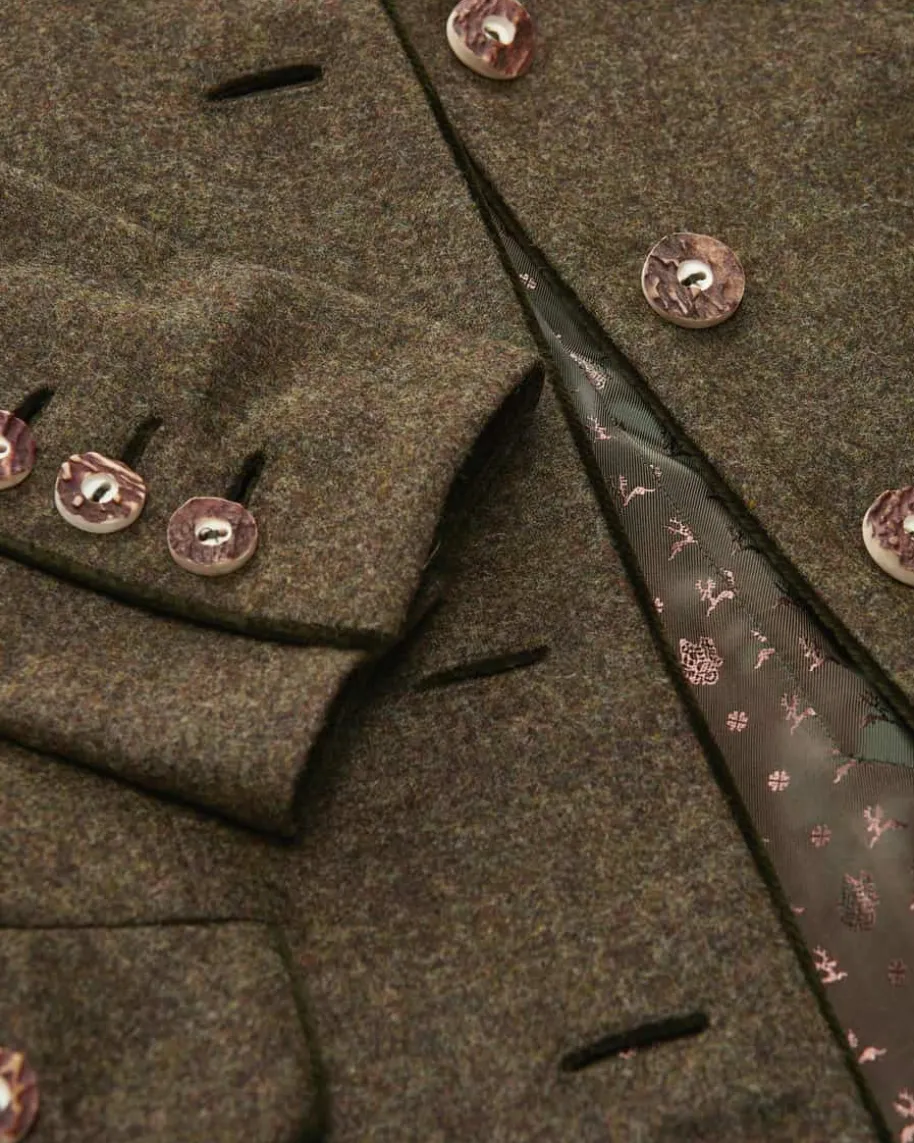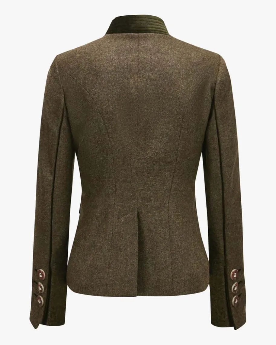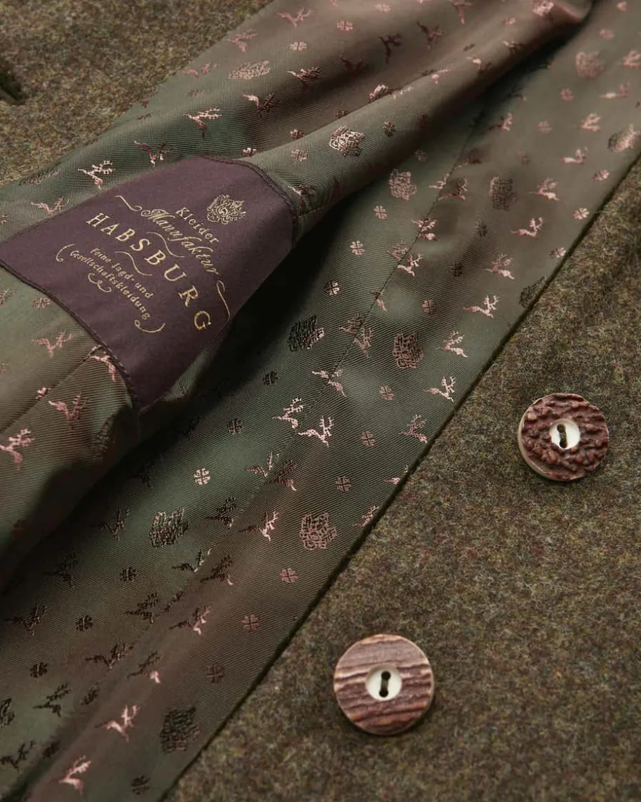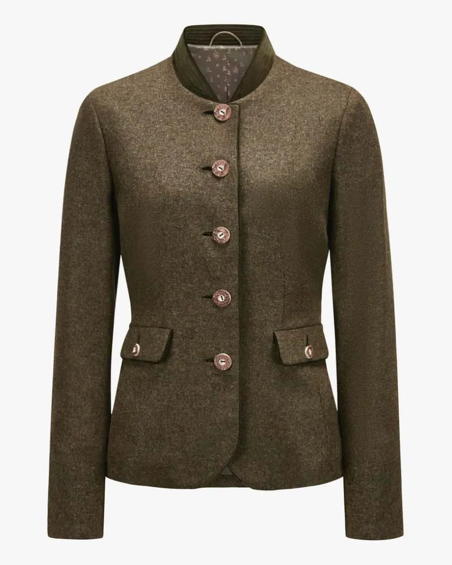 Mariella Trachtenblazer für Damen von Habsburg in Khaki und Dunkeloliv. Dastaillierte Modell besticht dank der hochwertigen Schurwoll-Qualität mitangenehmem Griff, während klassische Details sowie kontrastierende Samt-Einsätzedas traditionelle Gesamtbild perfekt ergänzen.