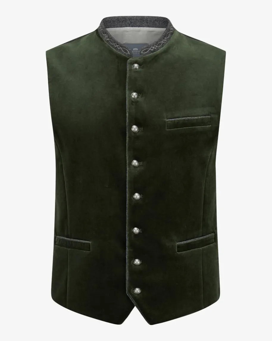 Maximilian Trachtenweste für Herren von LODENFREY in Lorbeerund Schwarz. DasModell präsentiert sich dank moderner Samt-Vorderseite undchangierenderJacquard-Rückseite in traditionell-eleganter Aufmachung.Zudem setzen dieaufwendigen Knöpfe, die in sieben handwerklichen Schrittenin Bayern gefertigtwerden, stilvolle Akzente.