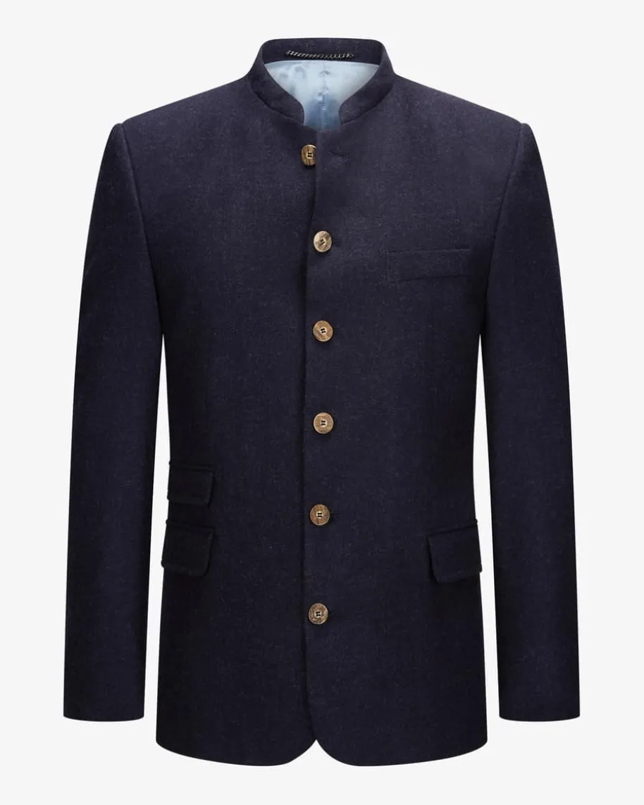 Maxvorstadt Trachten-Janker für Herren von Windsor in Dunkelblau. SchlichteEleganz gepaart mit traditionellen Details wie den rustikalen Hornknöpfenschaffen ein stilvolles Gesamtbild, während die Loden-Qualität mit zeitlosemCharme punktet. Zudem lässt sich dieser Janker ideal zur Lederhose kombinieren.