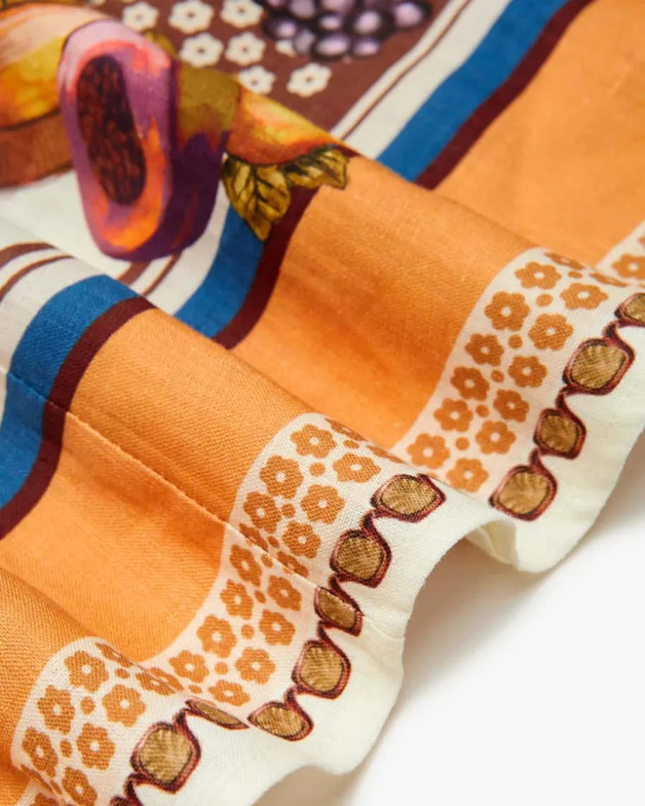 Mercado Leinenkleid für Damen von Alémais in Bunt. Das Kreativstudio aus Sydneymit Fokus auf kunstvolle Prints, nachhaltiges Design und nostalgische Ästhetikist unverwechselbar durch Collage-artige Muster, Patchwork-Effekte und Vintage-Flair. Auch dieses Modell punktet mit hochwertiger Leinen-Qualität sowiekreativem Allover-Print mit buntem Obst und Gemüse, während die feminineSilhouette mit Puffärmeln sommerliche Leichtigkeit versprüht.