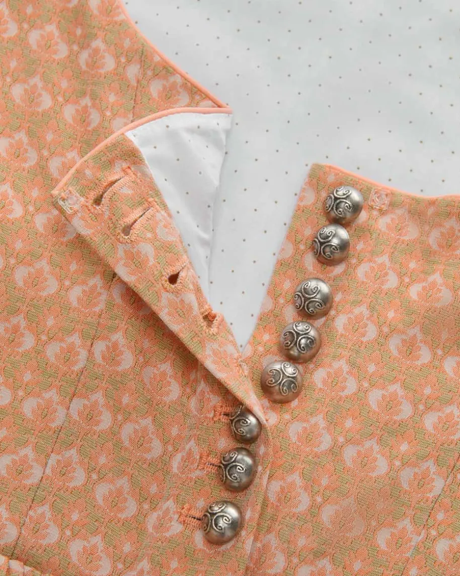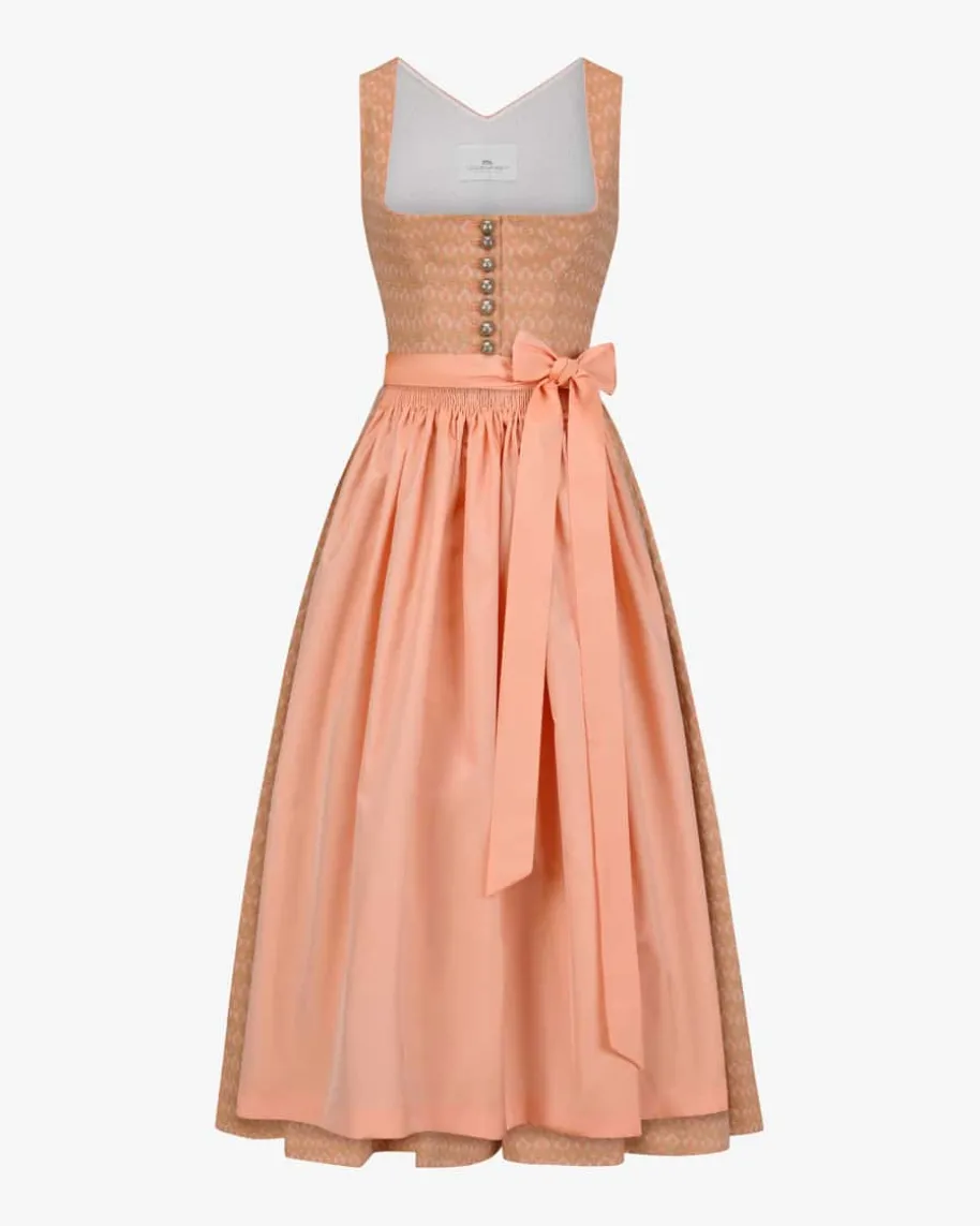Midi-Dirndl mit Schürze für Damen von LODENFREY München 1842 in Apricot, Beigeund Creme. Jahrelange Erfahrung, hochwertige Verarbeitung und viel Liebe zumDetailzeichnen die exklusiven Kreationen aus unserem Hause aus. Das Modell bestichtdurch seine hochwertige Qualität in Ornamenten Allover-Dessin, während diesilberfarbenen Kugelknöpfe und die changierende Schürze das Gesamtbildharmonisch abrunden.