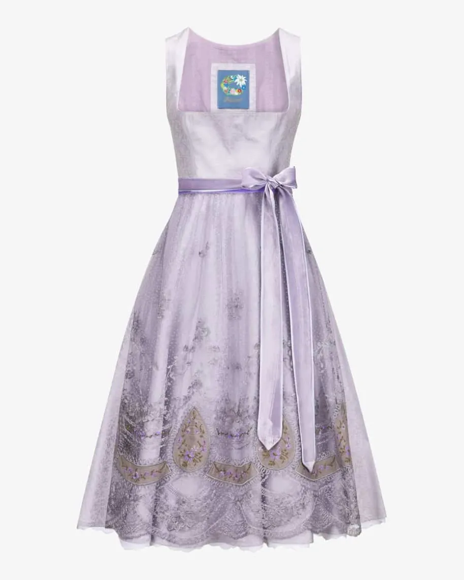 Midi-Dirndl mit Seidenschürze für Damen von Edelweiß in Lavendel und Silber. DasModell begeistert mit feiner Jacquard-Verarbeitung und traditionellen Details.Die semitransparente Mesh-Schürze mit floralen und filigranen Stickereien sowieder Samt-Besatz rundet den Trachten-Look feminin ab.