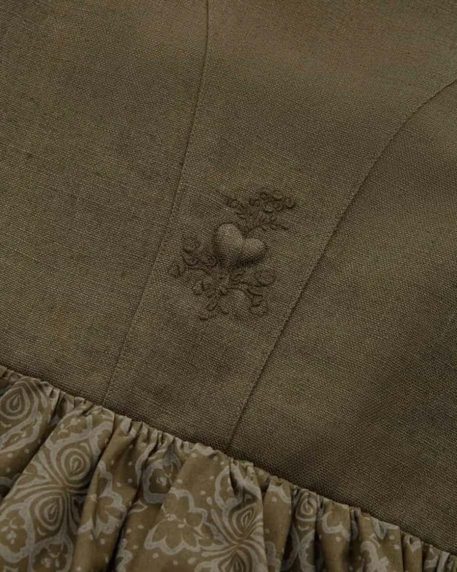 Midi-Wiesndirndl mit Schürze für Damen von LODENFREY in Oliv. JahrelangeErfahrung, hochwertige Verarbeitung und viel Liebe zum Detail zeichnen dieexklusiven Kreationen aus. Das Mieder in traditioneller Leinen-Qualität wirddank des gereihten Rocks mit dem floralen Ornamente-Muster stilvoll ergänzt,während die changierende Schürze das hochwertige Gesamtbild gekonnt vollendet.Gleichzeitig verleiht eine raffinierte Herz-Stickerei auf der Rückseite desMieders Ihrem Trachten-Look das gewisse Etwas.
