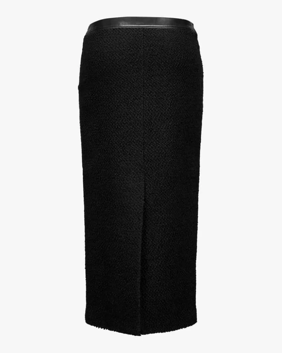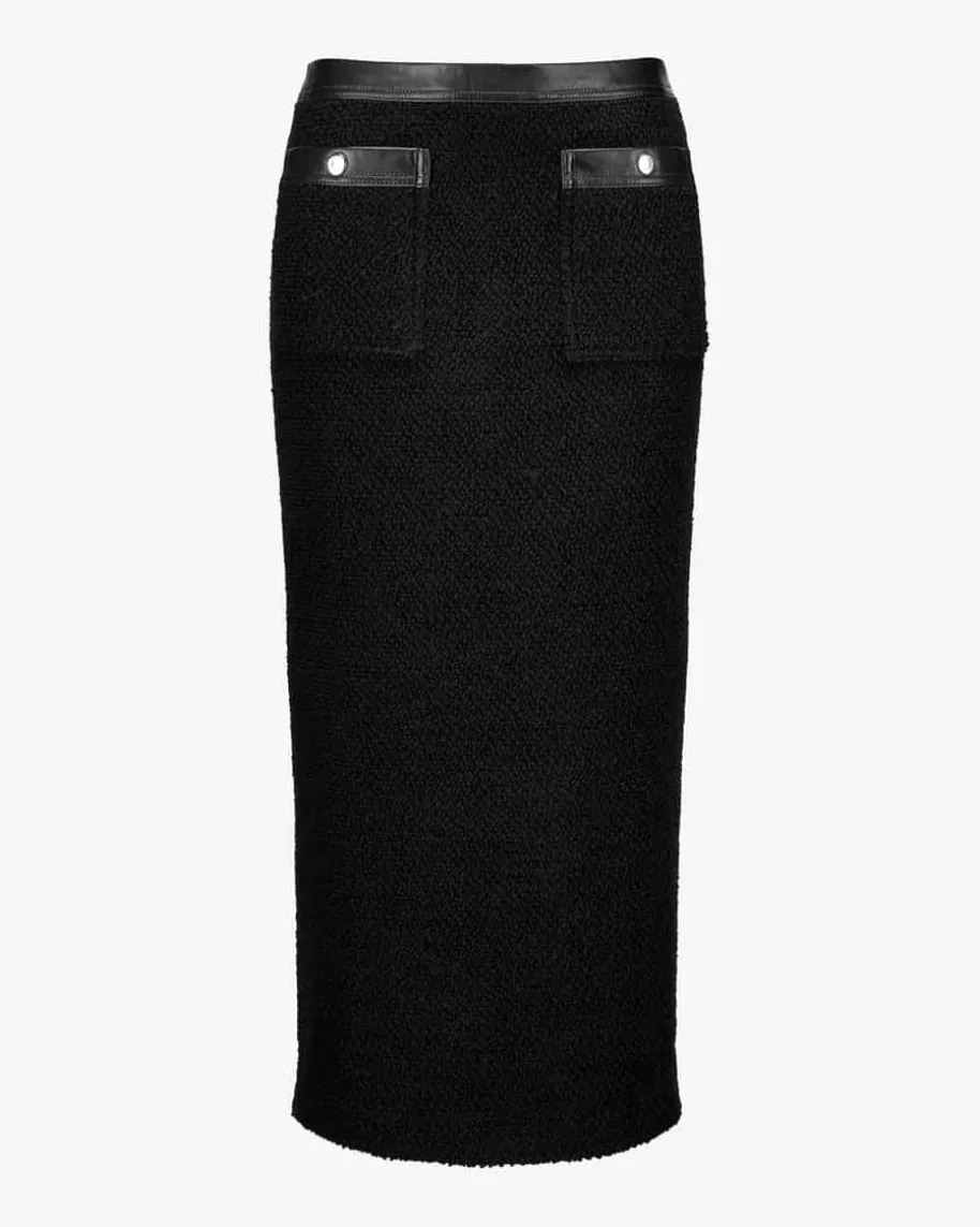 Midirock für Damen von Nanushka in Schwarz. Das Modell überzeugt mit derstrukturierten Materialverarbeitung in Bouclé-Optik mit angenehmen Tragemomentenund elegantem Look. Die tonigen Leder-Details und der seitliche Reißverschlussrunden den Style harmonisch ab.