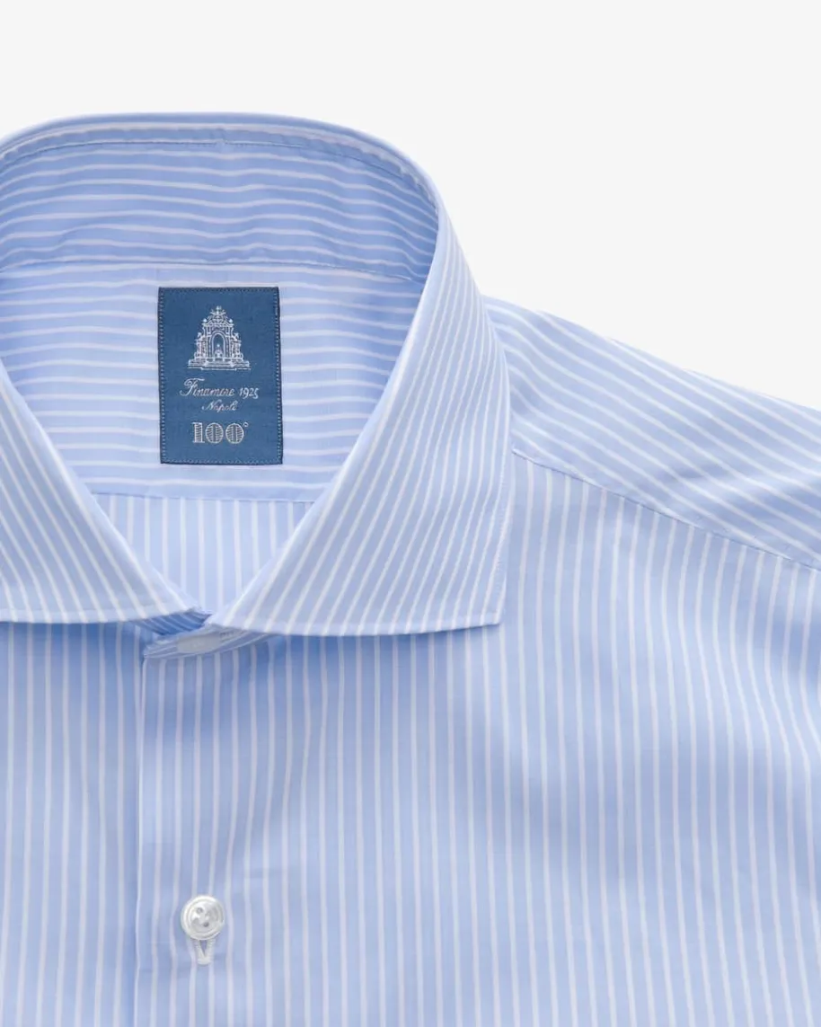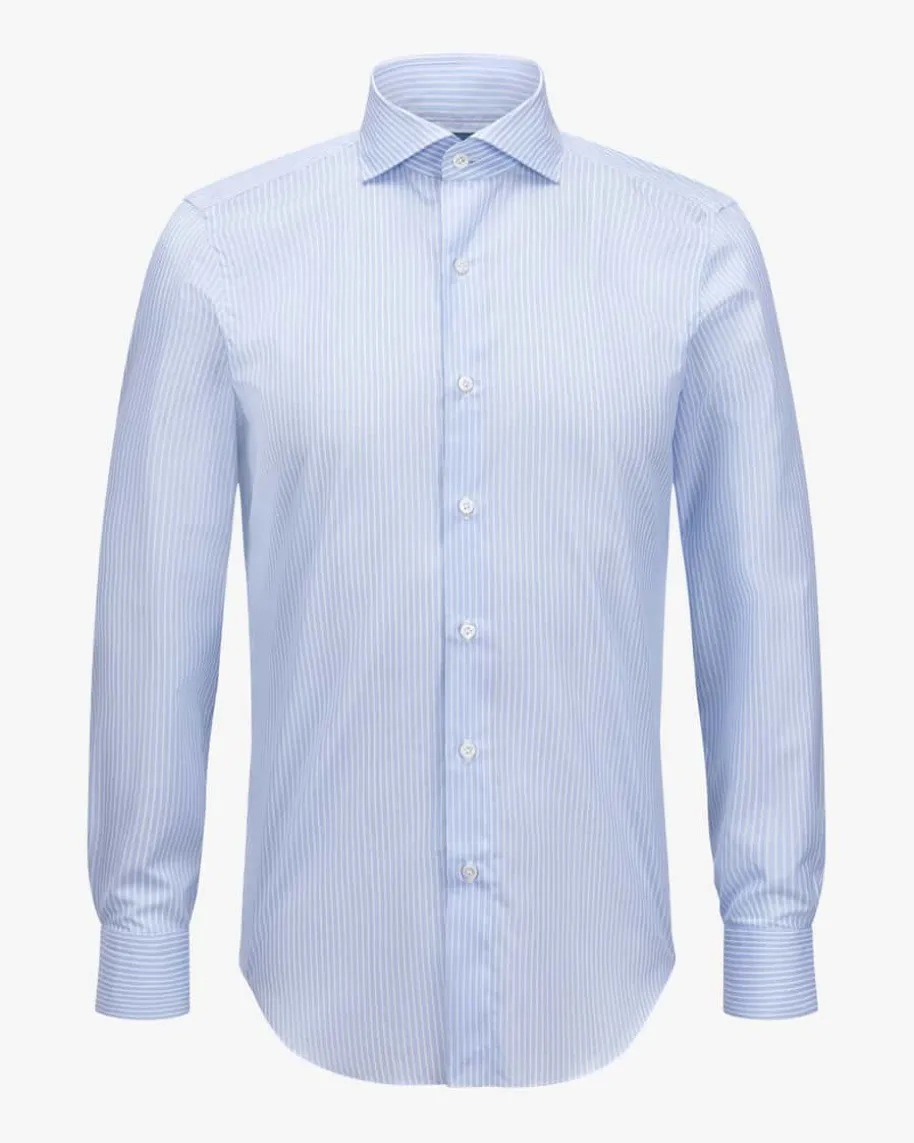 Milano Eduardo Businesshemd Slim für Herren von Finamore 1925 in Hellblau undWeiß. Das Modell aus angenehm leichter Baumwolle besticht dank des filigranenStreifen-Dessins in modischer Aufmachung, während klassische Details denperfekten Begleiter für Business-Looks schaffen.