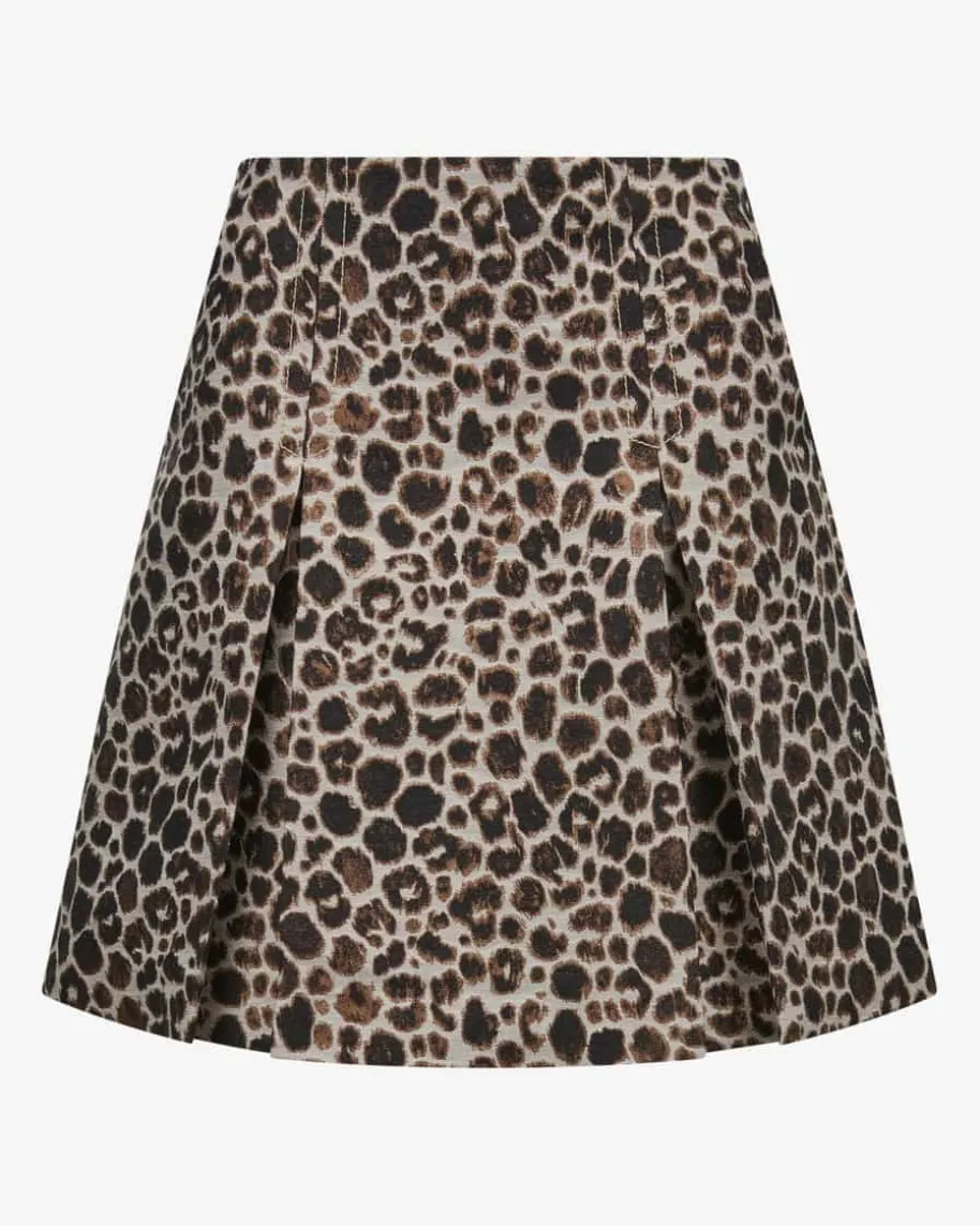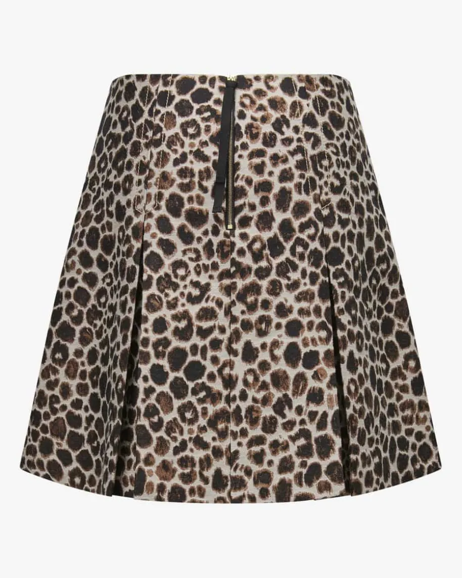 Minirock für Damen von Odeeh in Creme, Hellbraun und Schwarz. Das Modellavanciert dank der robusten Jacquard-Qualität mit Leo-Muster zum modischenBlickfang, während das Kellerfalten-Design den letzten Schliff verleiht.