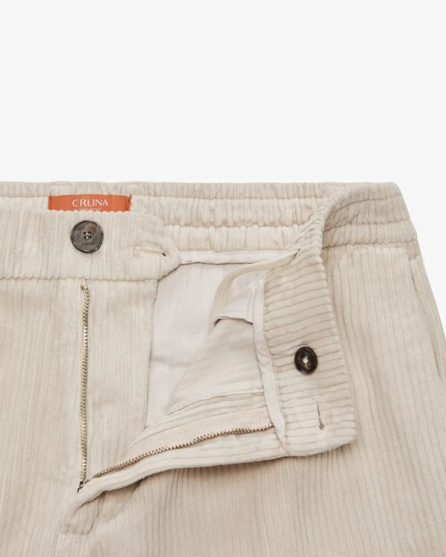 Mitte Cord-Joggpants für Herren von Cruna in Sand. Das verkürzte Modellbesticht durch die weiche Cord-Qualität sowie dem elastischen Bund mitinnenliegendem Tunnelzug als legerer Begleiter mit modernem Charakter, welcherdurch die Bundfalten einen stilvollen Touch erhält.