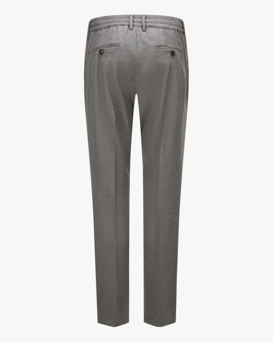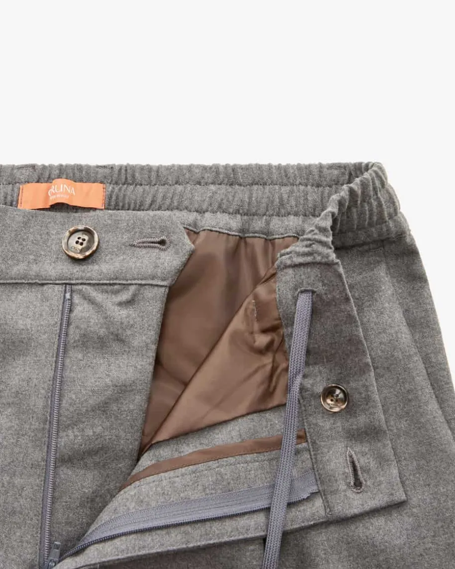 Mitte Wollhose für Herren von Cruna in Grau. Das verkürzte Modell besticht durchden weichen Woll-Cashmere-Mix mit innenliegendem Tunnelzug als angenehmerBegleiter, welcher durch die Bundfalten und klassische Details einen stilvollenTouch erhält.